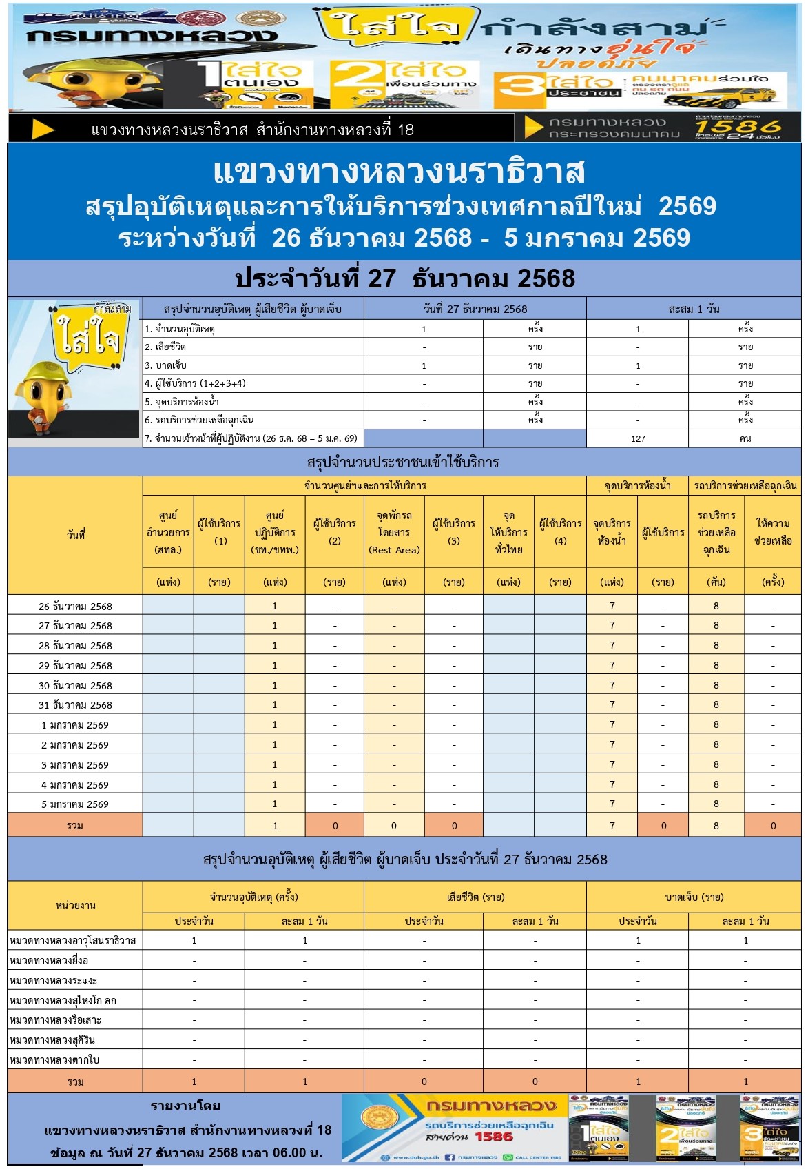 สรุปรายงานอุบัติเหตุและการให้บริการช่วงเทศกาลปีใหม่ 2569 ประจำวันที่ 27 ธันวาคม 2568