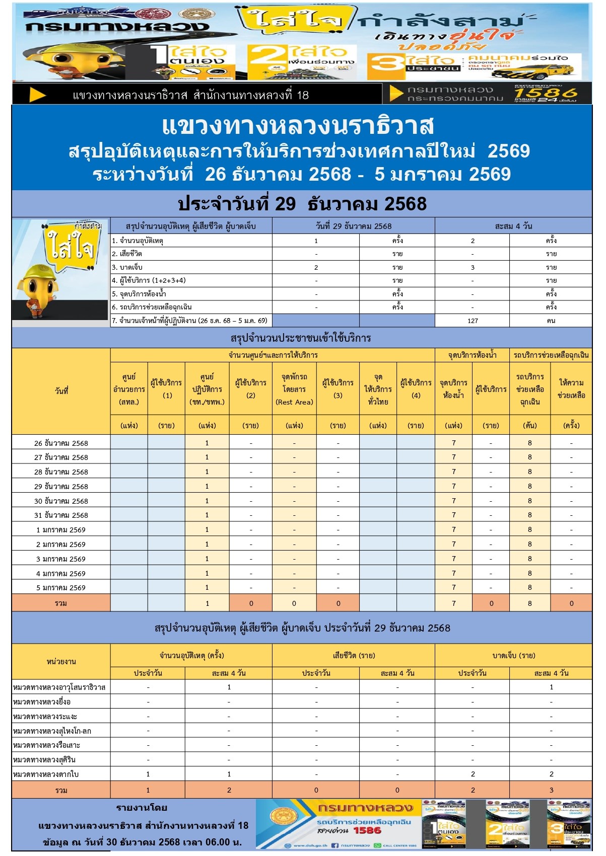 สรุปรายงานอุบัติเหตุและการให้บริการช่วงเทศกาลปีใหม่ 2569 ประจำวันที่ 29 ธันวาคม 2568