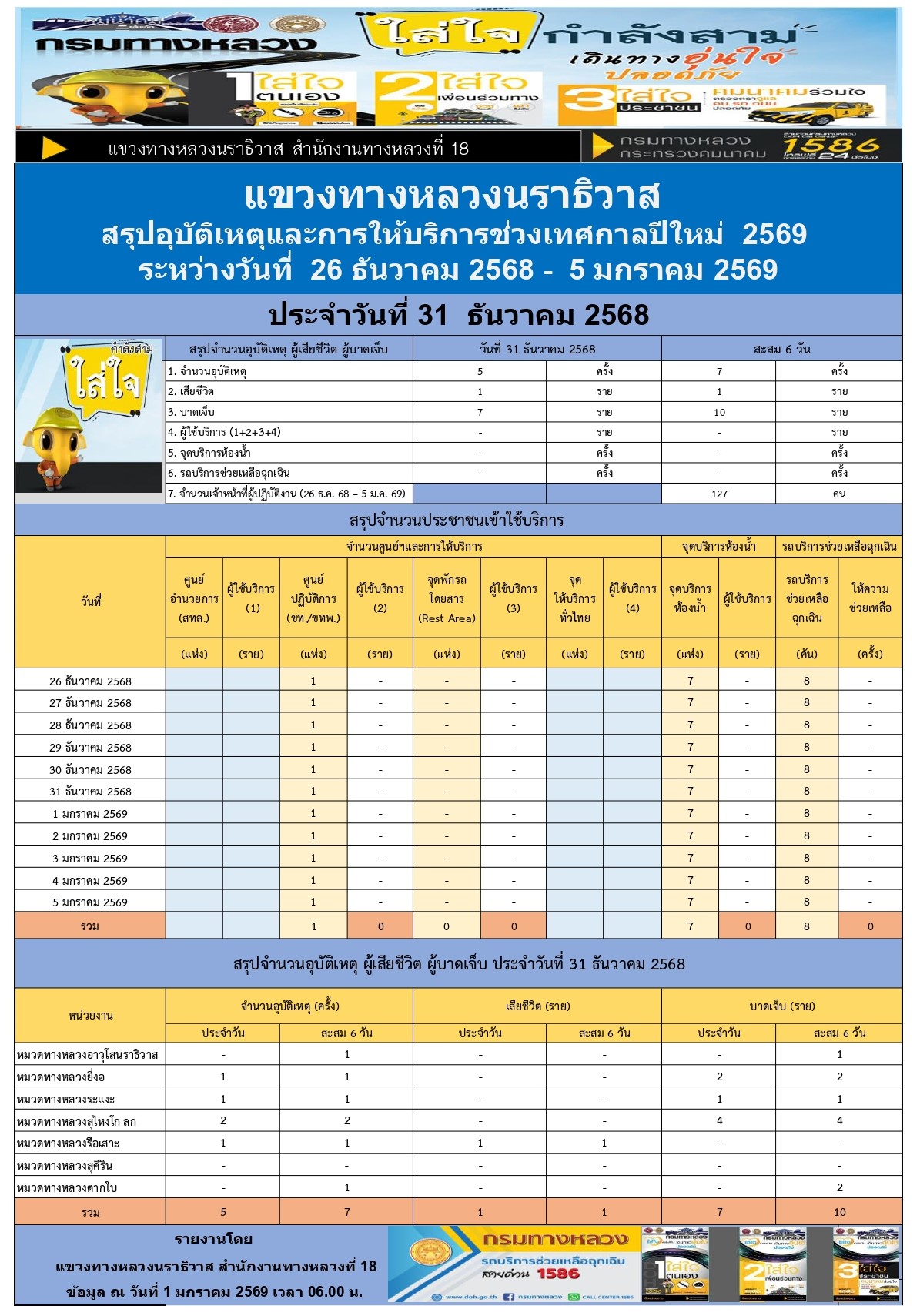 สรุปรายงานอุบัติเหตุและการให้บริการช่วงเทศกาลปีใหม่ 2569 ประจำวันที่ 5 มกราคม 2569