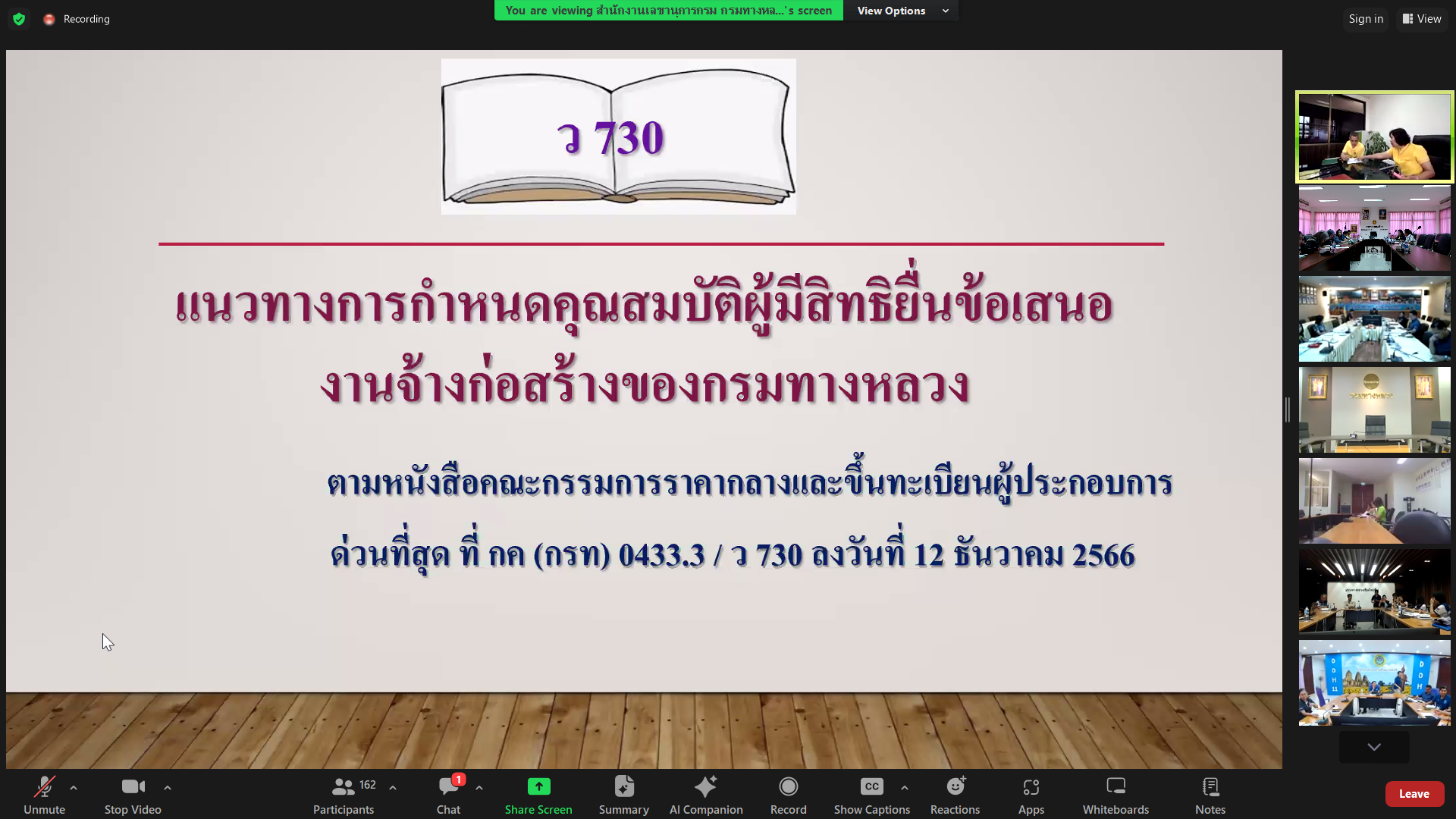 ร่วมประชุมตัวแทนเงินทุนหมุนเวียน ระดับ PS และวิศวกรแผนงาน (เครื่องกล) เพื่อติดตามผลการดำเนินงานเงินทุนหมุนเวียน แผน-ผลรายได้ค่าเช่า แผน-ผล การขายทอดตลาด และเรื่องอื่นๆ ที่เกี่ยวข้อง