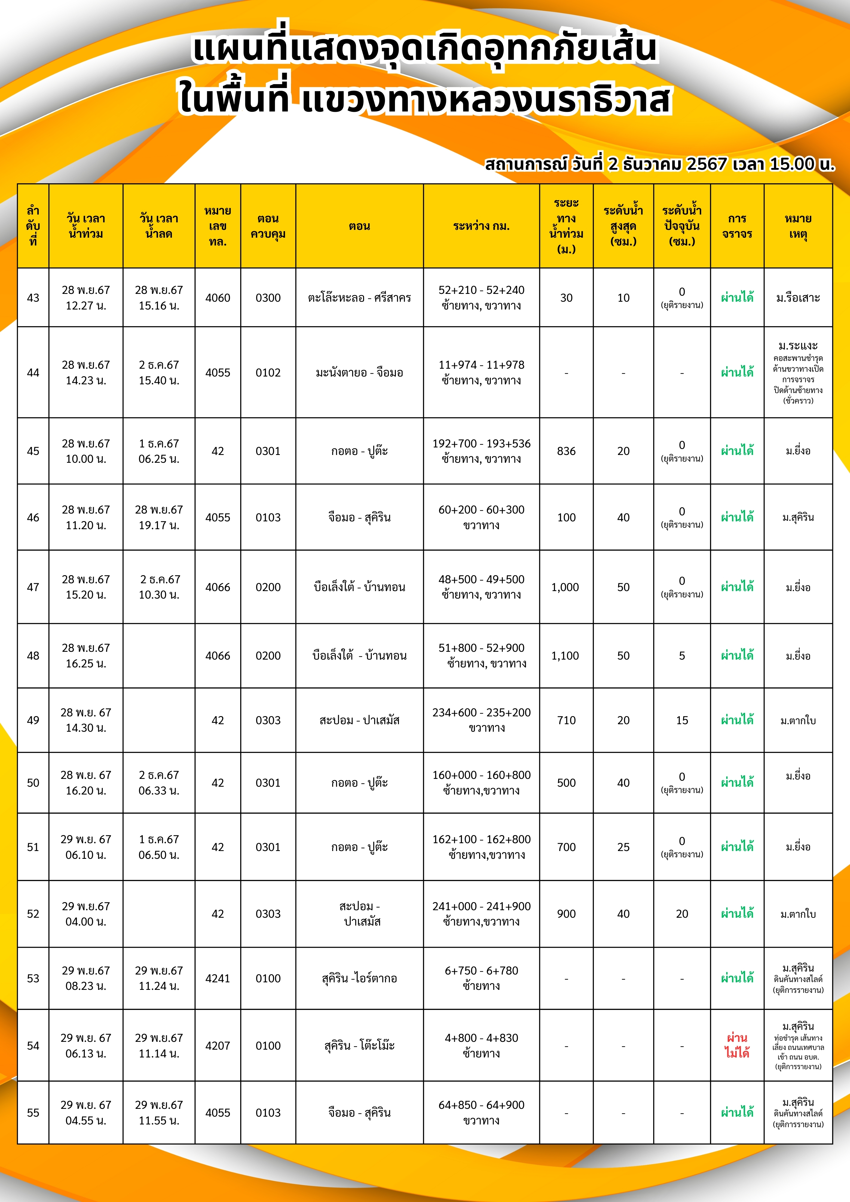 แขวงทางหลวงนราธิวาส ขอรายงานสถานการณ์อุทกภัยในพื้นที่จังหวัดนราธิวาส วันเวลาที่ update วันที่ 5 ธ.ค. 67 เวลา 20.00 น.