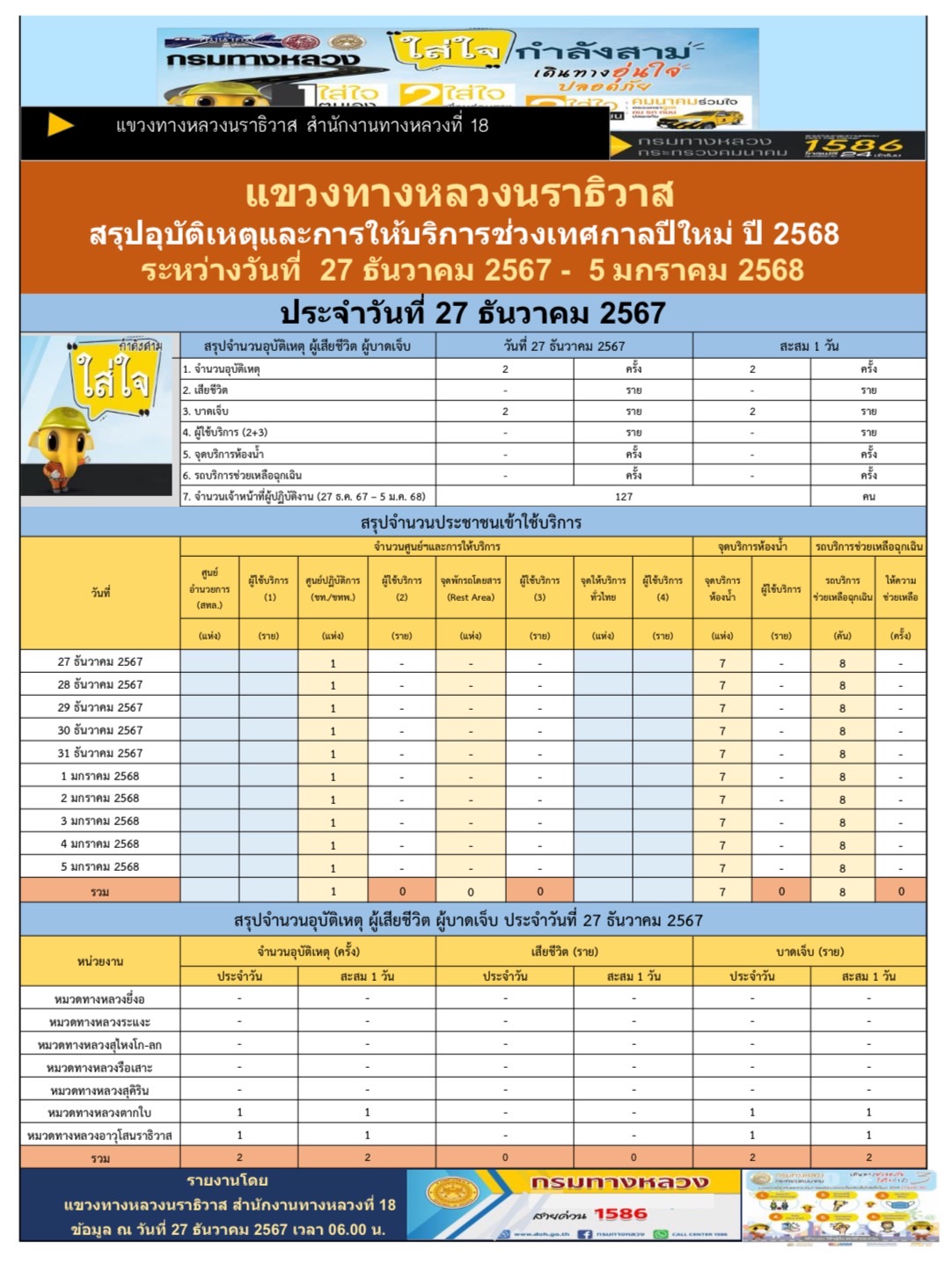 สรุปรายงานอุบัติเหตุและการให้บริการช่วงเทศกาลปีใหม่ 2568 ประจำวันที่ 27 ธันวาคม 2567