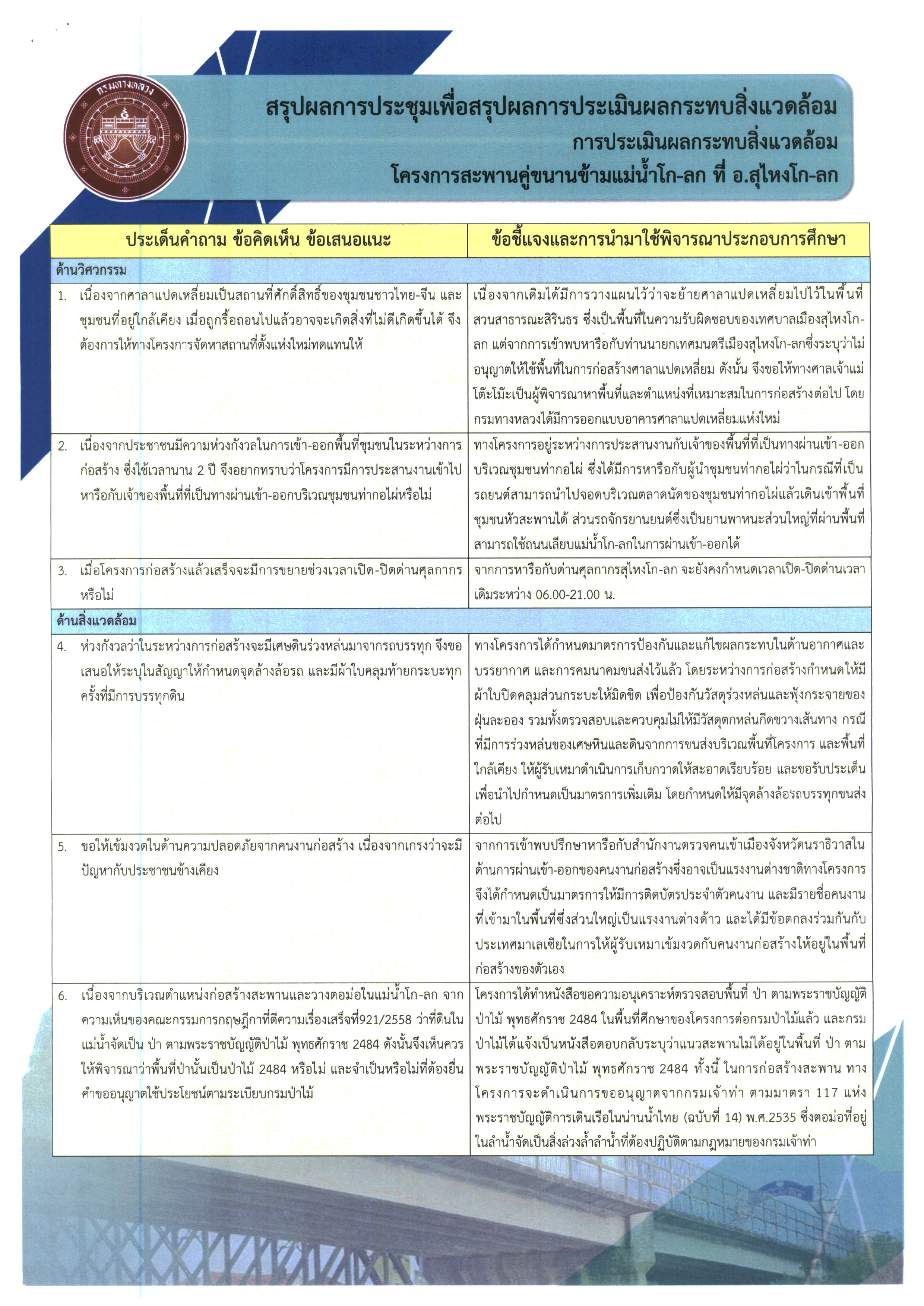 สรุปผลการประชุมเพื่อหารือแนวทางการประเมินผลกระทบสิ่งแวดล้อม การประเมินผลกระทบสิ่งแวดล้อม โครงการสะพานคู่ขนานข้ามแม่น้ำโก-ลก ที่ อ.สุไหงโก-ลก