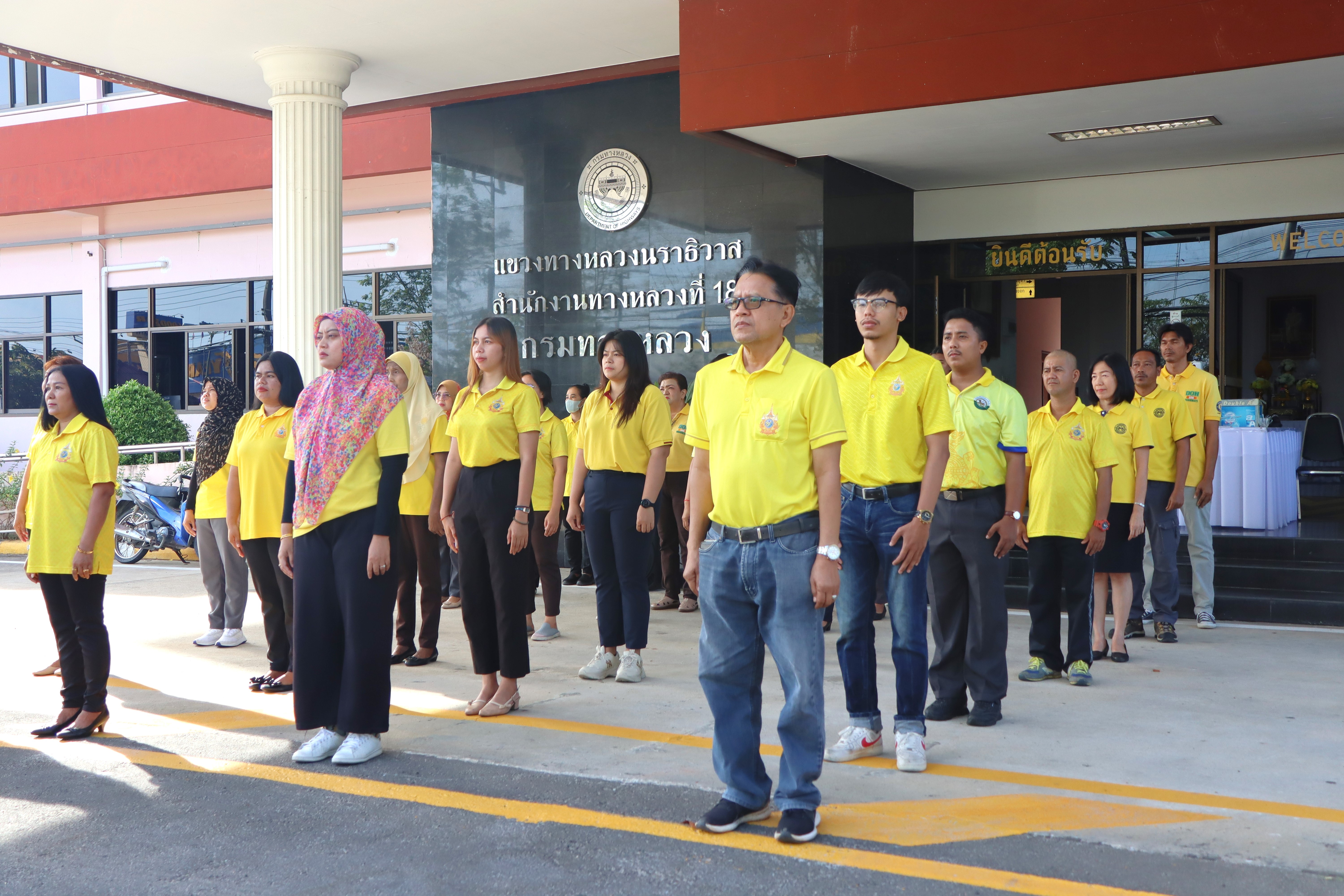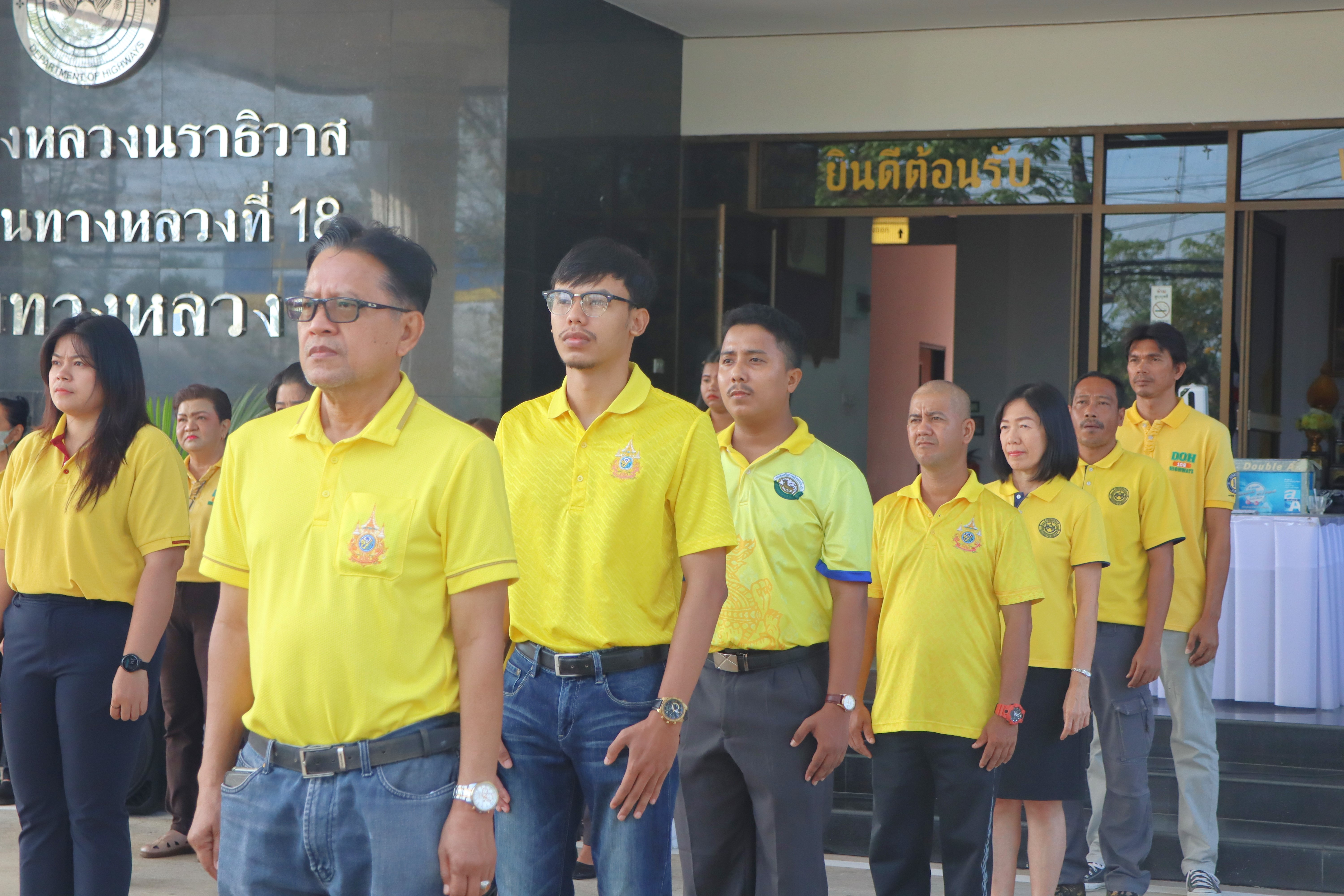 นายปฏิเวชวุฒิศักย์ สุขขี ผู้อำนวยการแขวงทางหลวงนราธิวาส มอบหมายให้รองผู้อำนวยการแขวงทางหลวงนราธิวาส ฝ่ายปฏิบัติการ ฝ่ายบริหาร ผู้อำนวยการหมวดทางหลวงอาวุโสนราธิวาส นำข้าราชการ และเจ้าหน้าที่แขวงทางหลวงนราธิวาส ร่วมกิจกรรมเข้าแถวเคารพธงชาติ โดยร่วมแต่งกายด้วยเสื้อสีเหลืองเพื่อเฉลิมพระเกียรติพระบาทสมเด็จพระเจ้าอยู่หัว เนื่องในโอกาสมหามงคลเฉลิมพระชนมพรรษา 6 รอบ 28 กรกฏาคม 2567 และเพื่อเสริมสร้างจิตสำนึกต่อสถาบันชาติ ศาสนา พระมหากษัตริย์ และการเป็นข้าราชการที่ดี เพื่อแสดงออกถึงความจงรักภักดีต่อชาติ ศาสนา พระมหากษัตริย์ และเป็นการเตรียมความพร้อมในการปฏิบัติราชการอีกทั้งยังเป็นการเพิ่มประสิทธิภาพในการทำงานเสริมสร้างความรัก ความสามัคคีในองค์กร