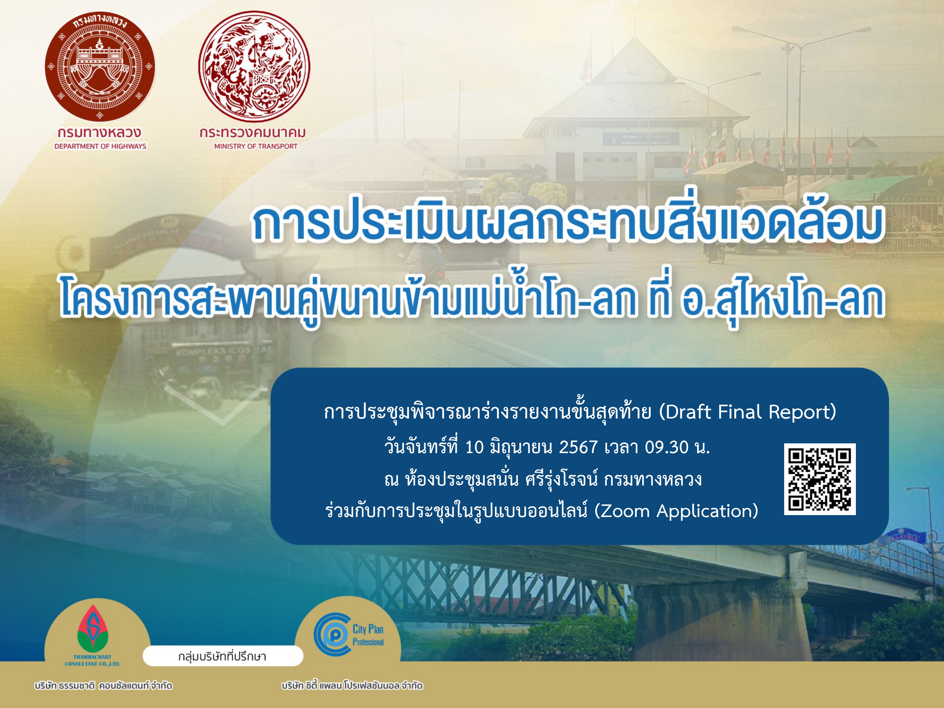นายปฏิเวชวุฒิศักย์ สุขขี ผู้อำนวยการแขวงทางหลวงนราธิวาส มอบหมายให้นางสาวศุภวรรณ์ นวลละออง วิศวกรโยธาปฏิบัติการ ร่วมประชุมพิจารณาร่างรายงานขั้นสุดท้าย (Draft Final Report) การประเมินผลกระทบสิ่งแวดล้อมโครงการสะพานคู่ขนานข้ามแม่น้ำโก-ลก ที่ อ.สุไหงโก-ลก โดยพิจารณาในข้อคิดเห็น งานออกแบบวิศวกรรม งานสิ่งแวดล้อม งานประชาสัมพันธ์และการมีส่วนร่วม ในรูปแบบออนไลน์ ผ่านระบบ Zoom Cloud Meeting ณ ห้องประชุมชั้น 3 แขวงทางหลวงนราธิวาส