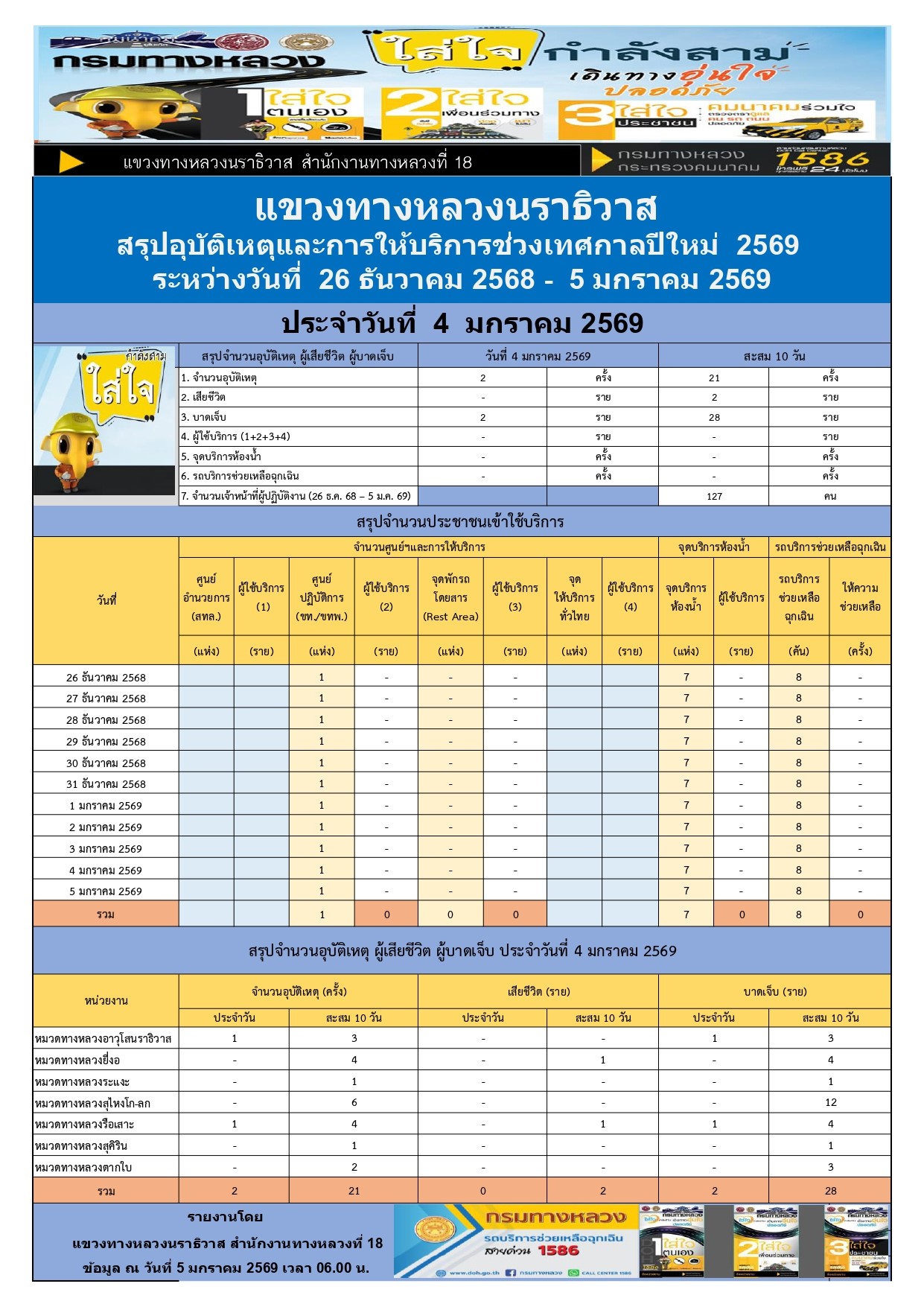 สรุปรายงานอุบัติเหตุและการให้บริการช่วงเทศกาลปีใหม่ 2569 ประจำวันที่ 4 มกราคม 2569
