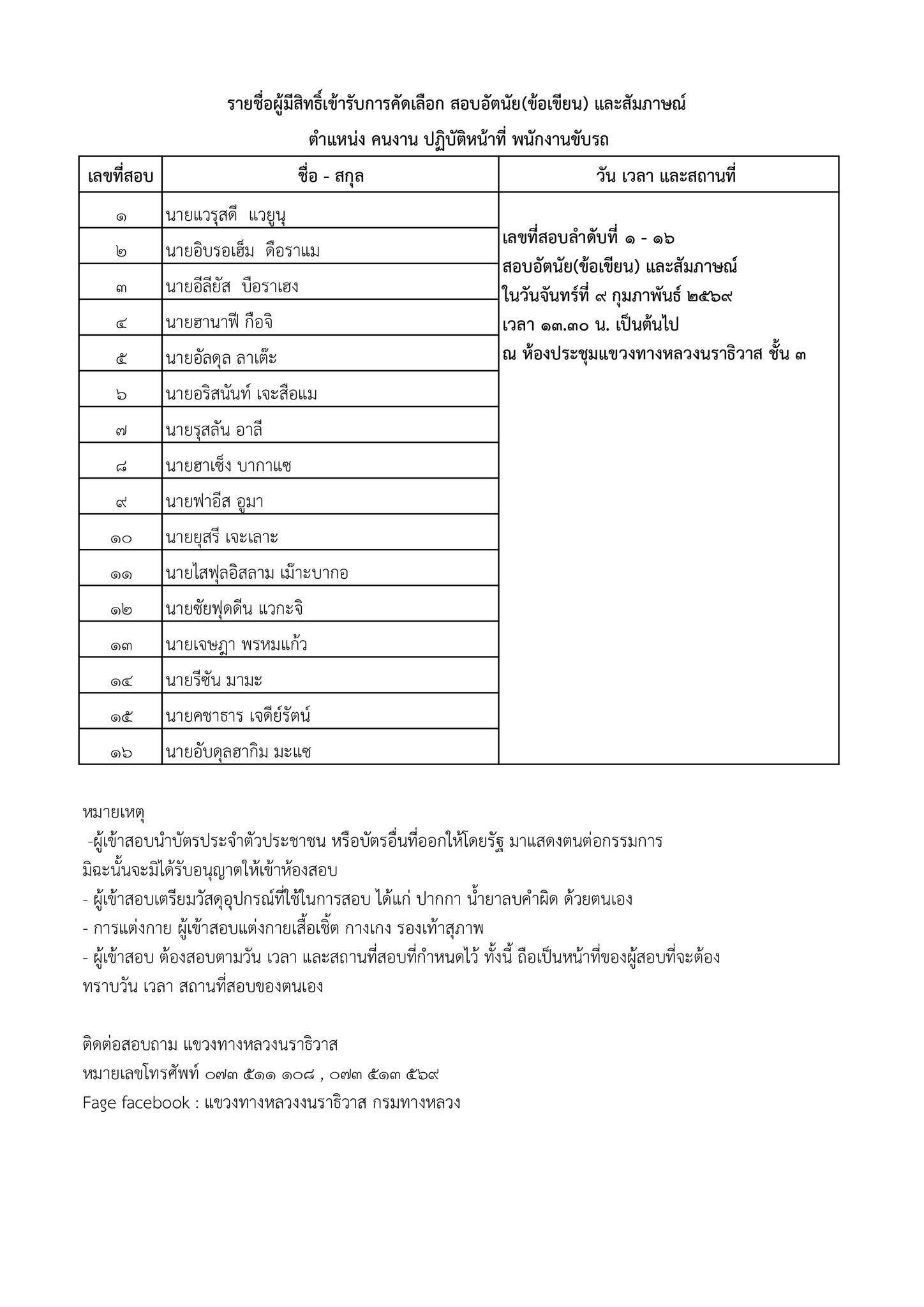 สถานที่สอบ ห้องประชุมแขวงทางหลวงนราธิวาส ชั้น 3