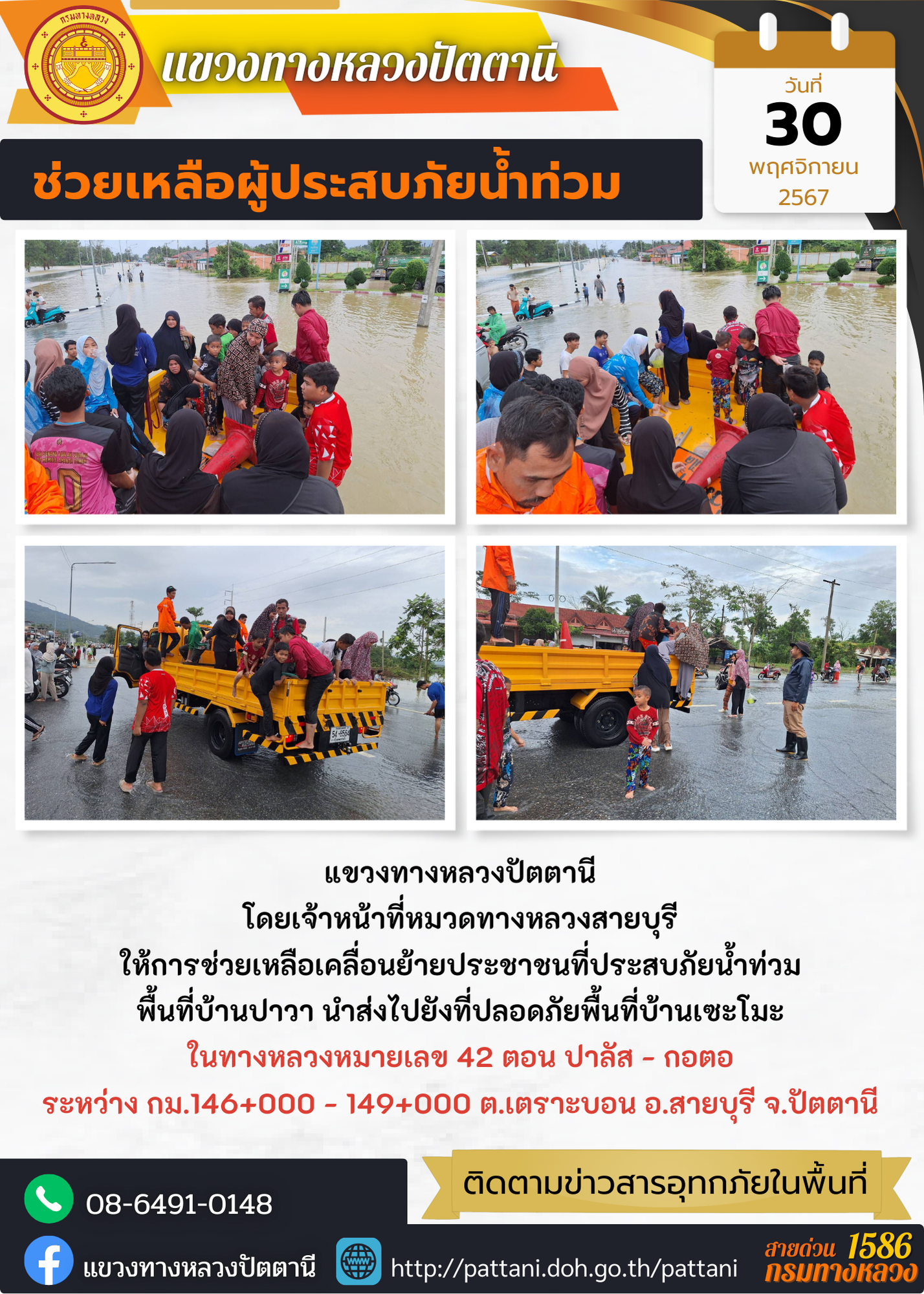 แขวงทางหลวงปัตตานี ให้ความช่วยเหลือผู้ประสบภัยน้ำท่วม