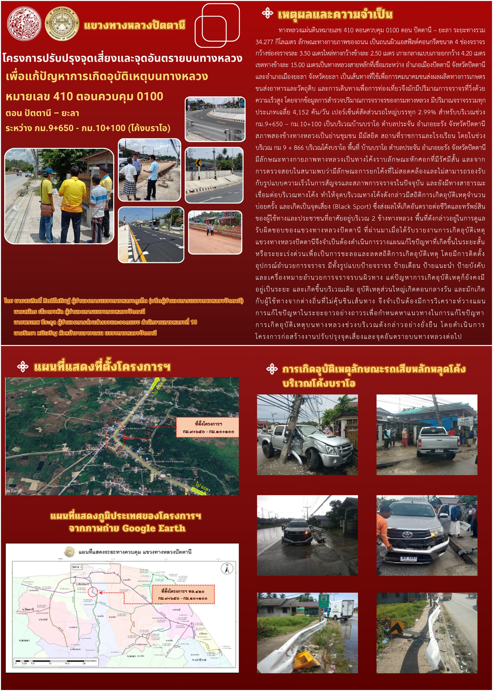 โครงการปรับปรุงจุดเสี่ยง และจุดอันตรายบนทางหลวง เพื่อแก้ไขปัญหาการเกิดอุบัติเหตุบนทางหลวง หมายเลข 410 ตอนควบคุม 0100 ตอน ปัตตานี - ยะลา ระหว่าง กม.9+650 - กม.10+100 (โค้งบราโอ)