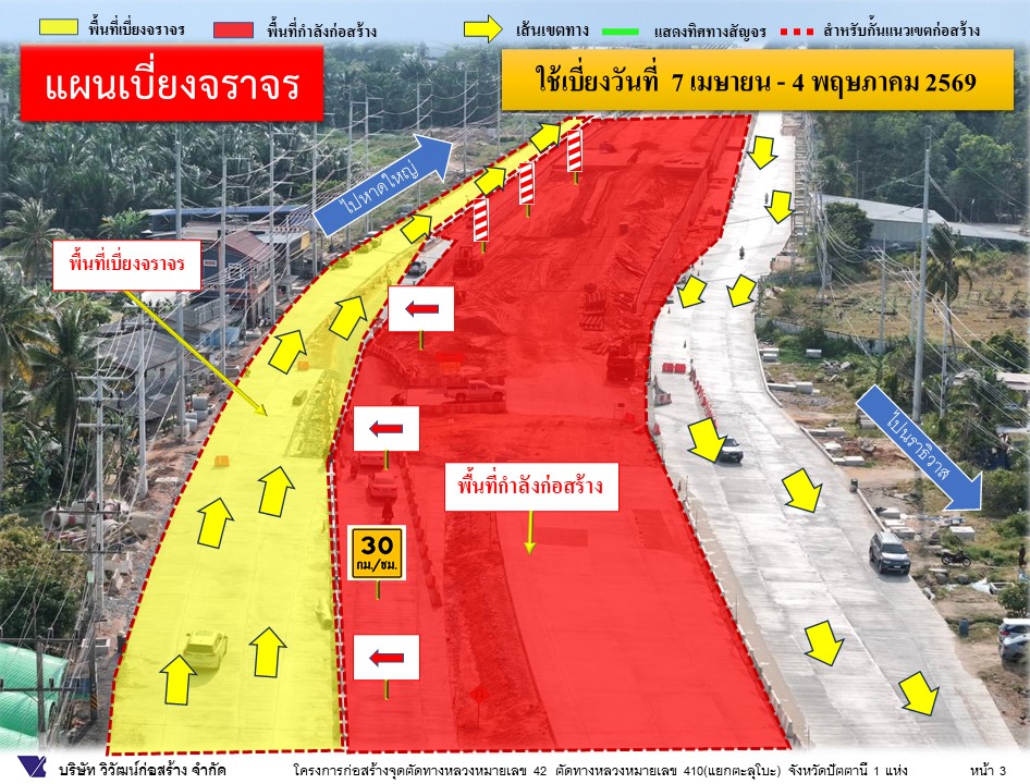 #ประชาสัมพันธ์ทางเบี่ยงการจราจร (ชั่วคราว) โครงการก่อสร้างสะพานจุดตัดทางหลวงหมายเลข 42 ตัดทางหลวงหมายเลข 410 (แยกตะลุโบะ) จ.ปัตตานี ระหว่าง วันที่ 7 เมษายน 2569 - 4 พฤษภาคม 2569