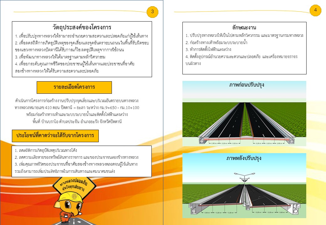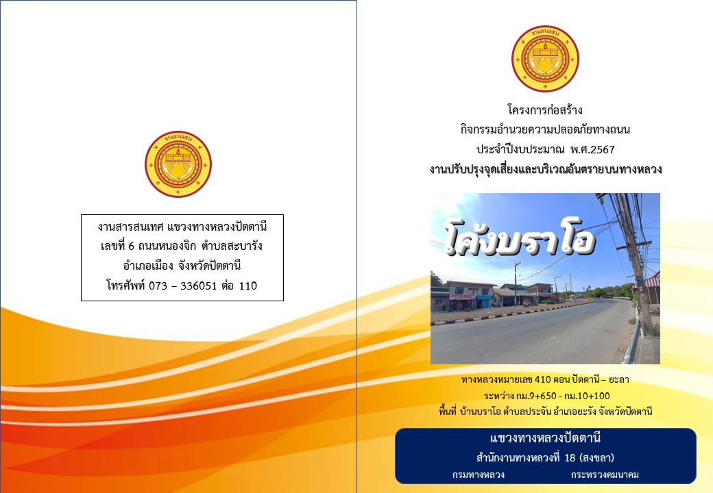 | แผ่นพับ งานปรับปรุงจุดเสี่ยงและบริเวณอันตรายบนทางหลวง ทางหลวงหมายเลข 410 ตอน ปัตตานี - ยะลา ระหว่าง กม.9+650 - กม.10+100 (สำหรับปริ๊นท์ A4) | 232 | ดาวน์โหลด |