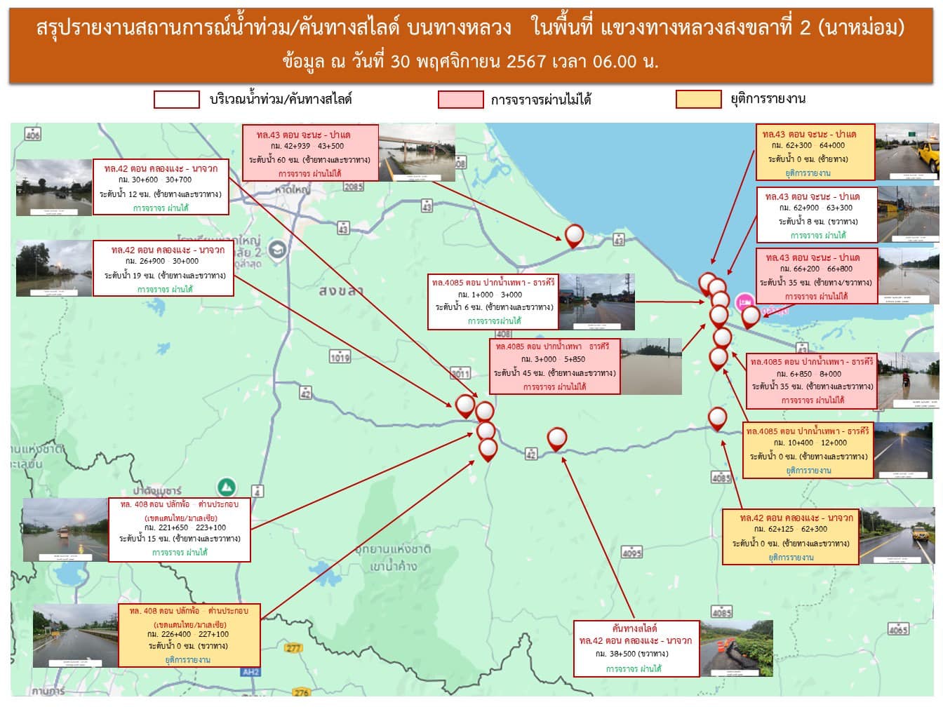 อัพเดทสถานการณ์น้ำท่วมของแขวงทางหลวงสงขลาที่2 (นาหม่อม) ณ วันที่ 30 พฤศจิกายน 2567 เวลา 06.00 น.