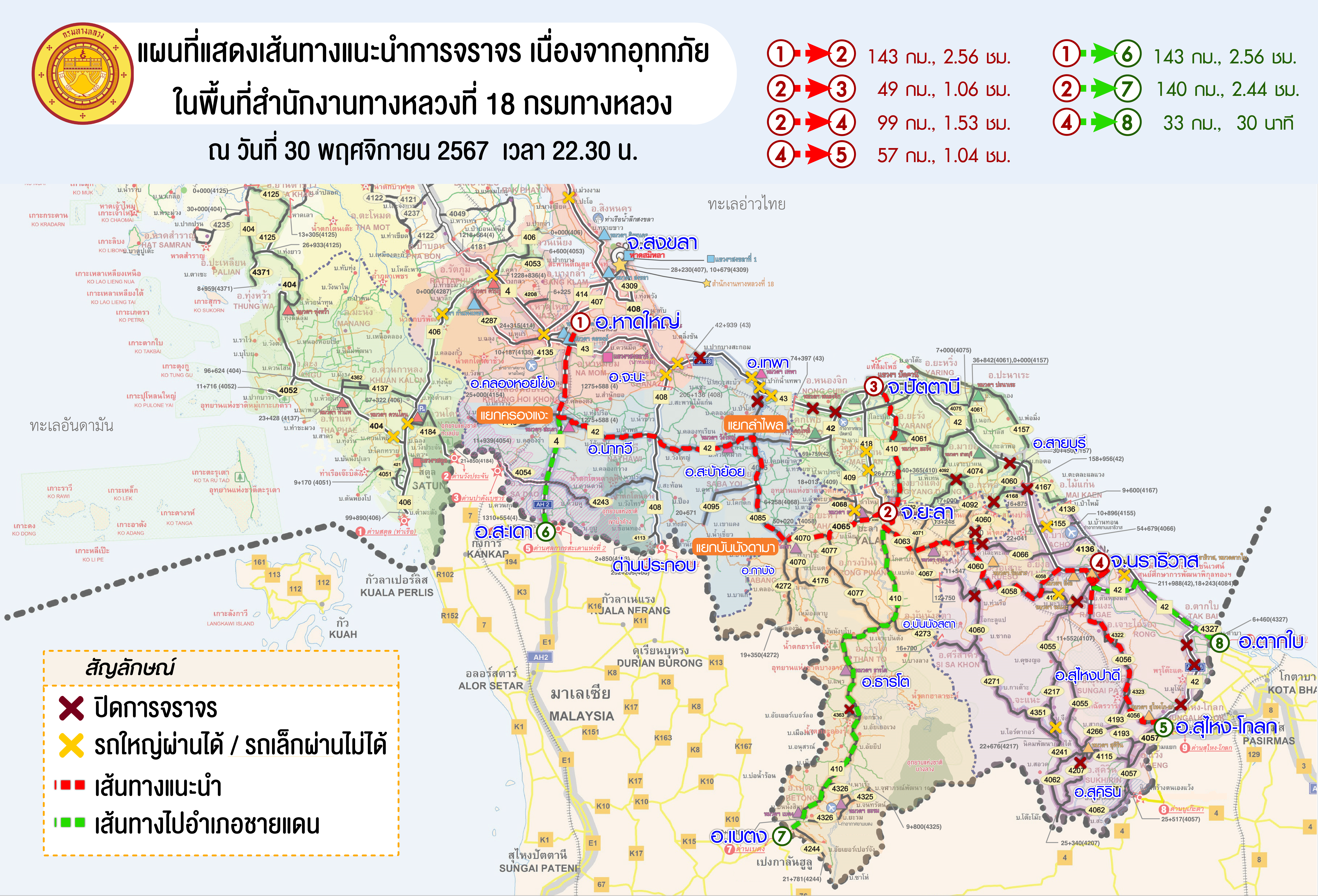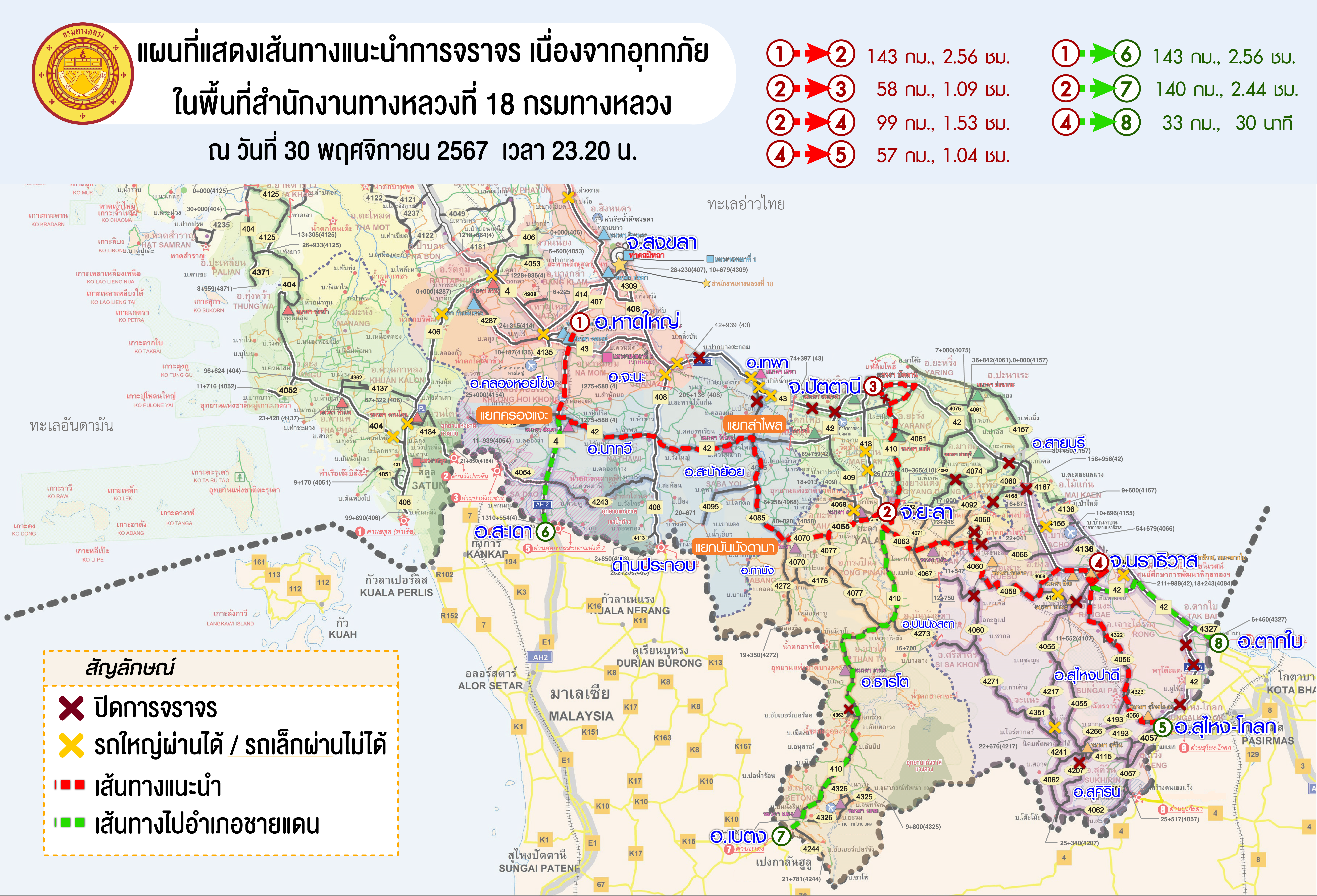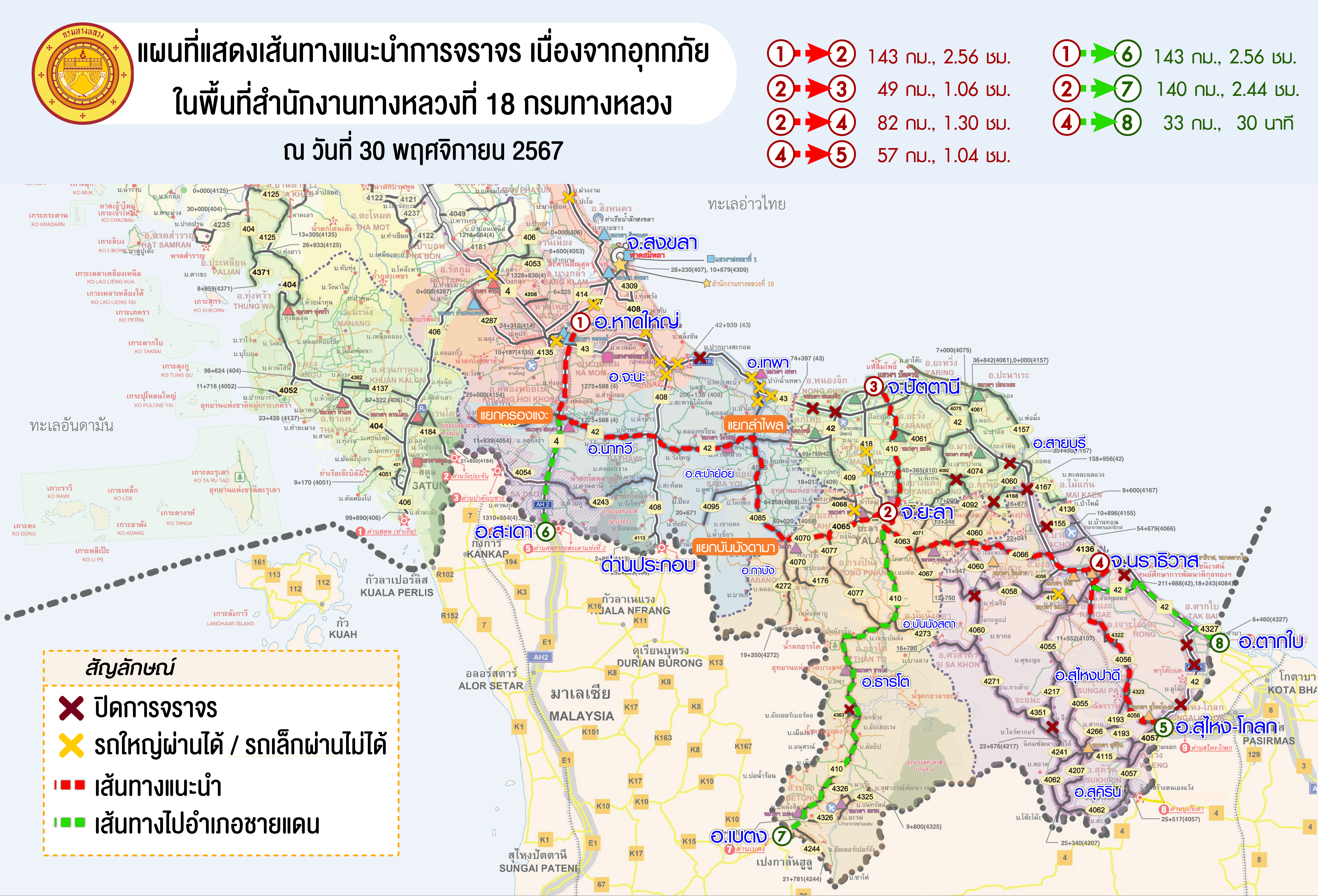 แผนที่แสดงเส้นทางแนะนำการจราจร ข้อมูล ณ วันที่ 30 พฤศจิกายน 2567