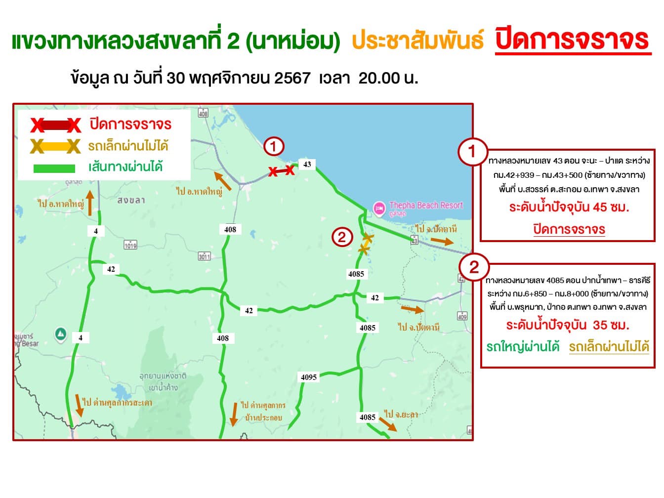 อัพเดทสถานการณ์น้ำท่วม แขวงทางหลวงสงขลาที่ 2 (นาหม่อม) วันที่ 30 พฤศจิกายน 2567 เวลา 20.00 น.