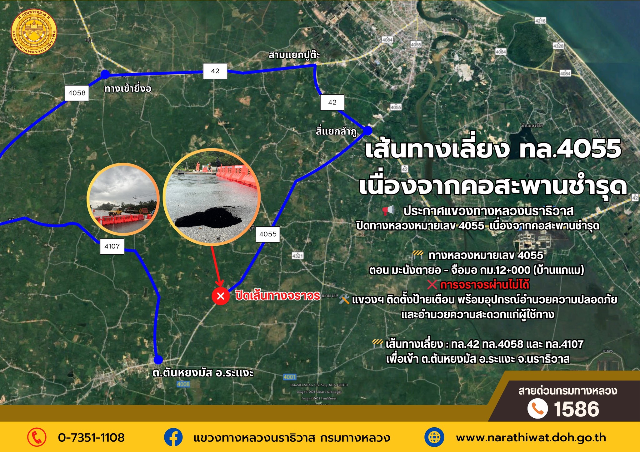 แขวงทางหลวงนราธิวาส ขอปิดทางหลวงหมายเลข 4055 เนื่องจากคอสะพานชำรุด