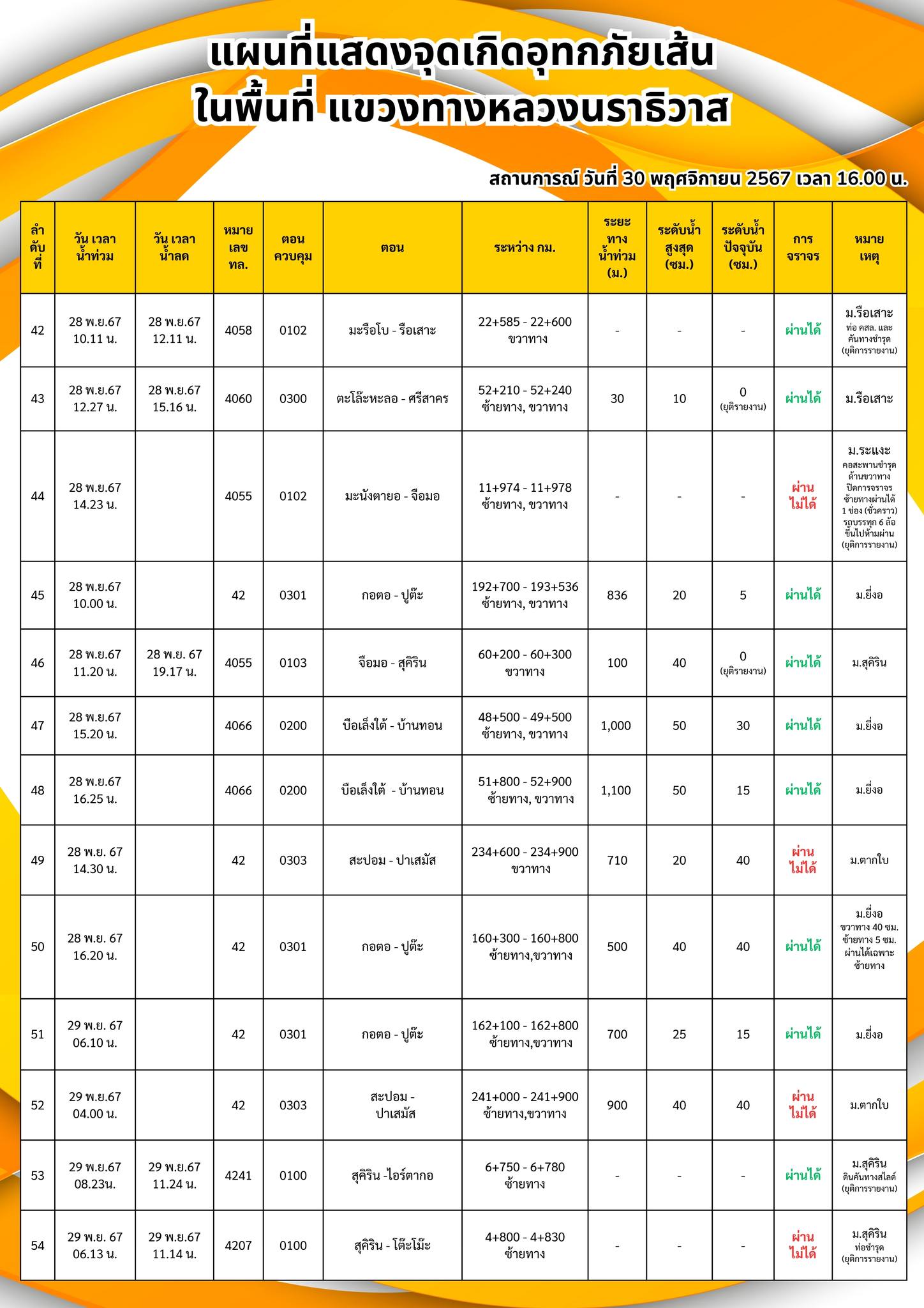แขวงทางหลวงนราธิวาส ขอรายงานสถานการณ์อุทกภัยในพื้นที่จังหวัดนราธิวาส วันเวลาที่ update วันที่ 30 พ.ย. 67 เวลา 16.00 น.