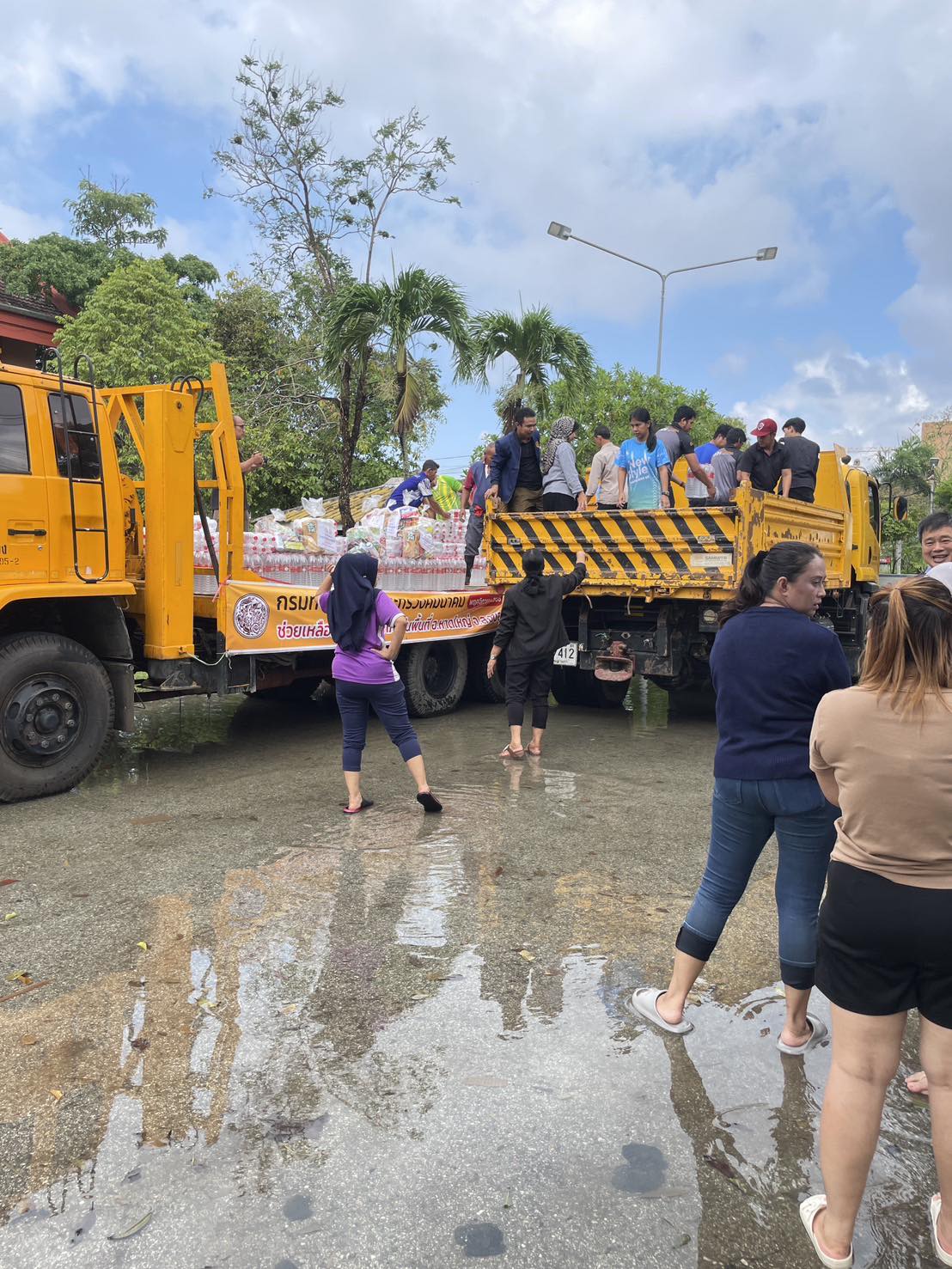 รถคาราวานกรมทางหลวง โดยเจ้าหน้าที่ฯ ได้รับภารกิจส่งถุงยังชีพและน้ำดื่มอย่างละ 1 คันรถ ไปยังแขวงทางหลวงนราธิวาส