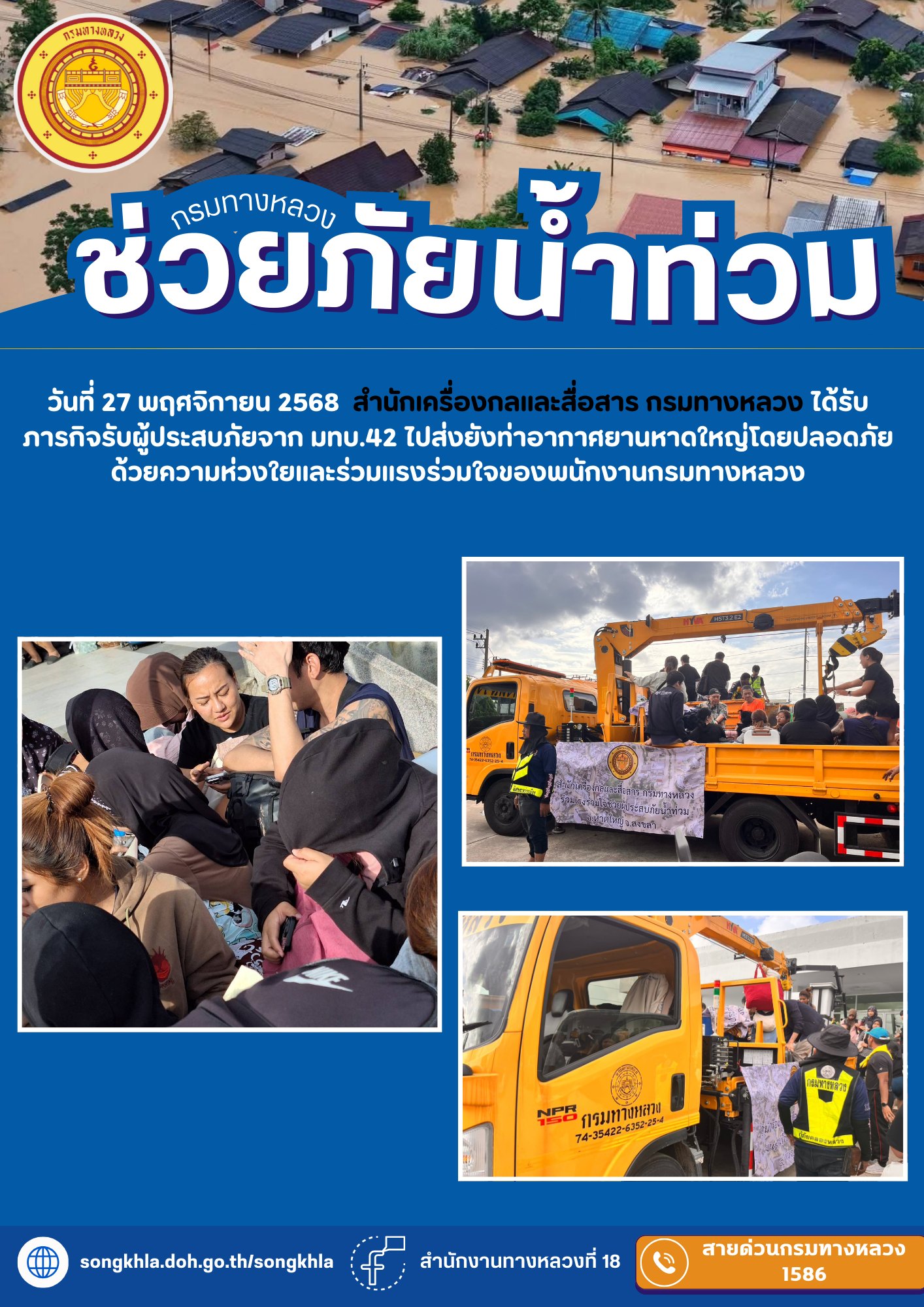 สำนักเครื่องกลและสื่อสาร กรมทางหลวง ได้รับภารกิจรับผู้ประสบภัยจาก มทบ.42 ไปส่งยังท่าอากาศยานหาดใหญ่