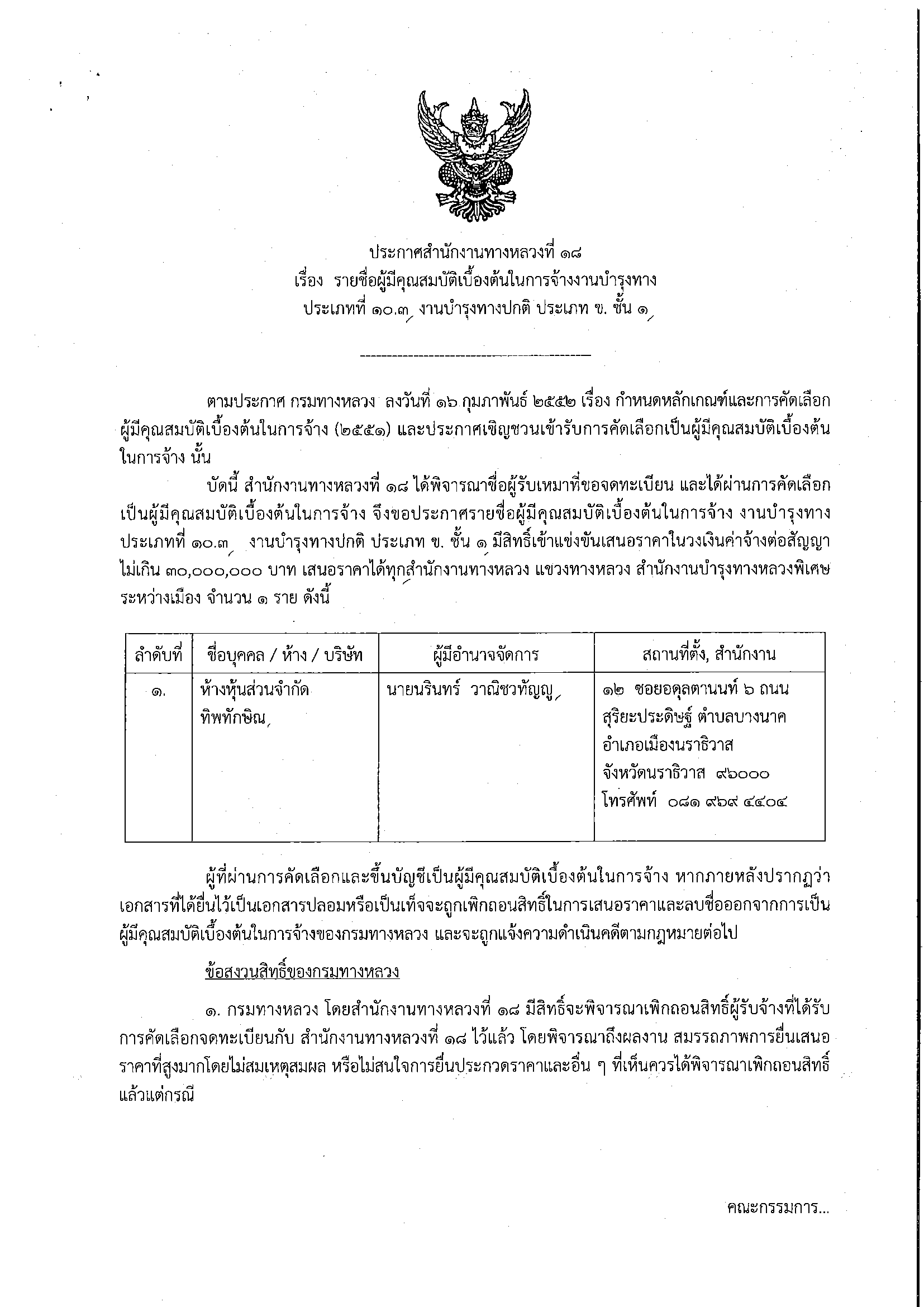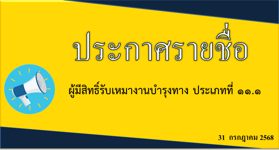 ประกาศรายชื่อผู้มีสิทธิ์รับเหมางานบำรุงทาง ประเภทที่ 11.1