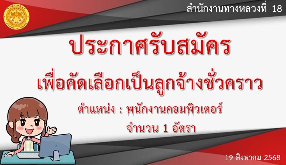 ประกาศรับสมัครเพื่อคัดเลือกเป็นลูกจ้างชั่วคราว ตำแหน่ง : พนักงานคอมพิวเตอร์ จำนวน 1 อัตรา