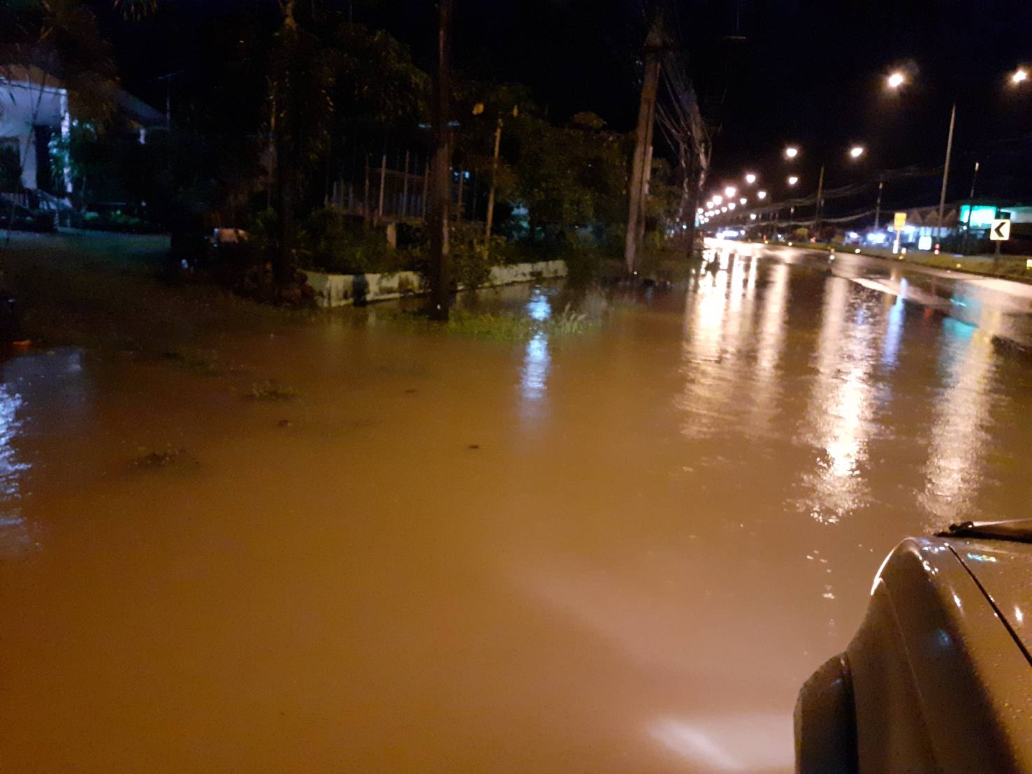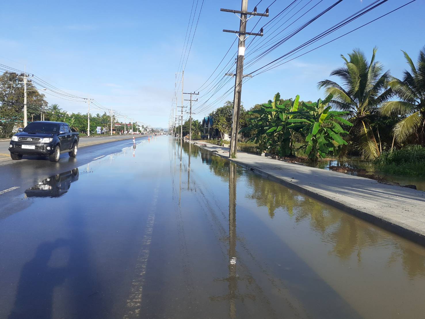 เนื่องจากฝนตกต่อเนื่อง ทำให้น้ำเออล้น ท่วมผิวจราจร ระดับน้ำด้านขวาและด้านซ้ายท่วมสูง 15-20. ซม. ข้างละ 1. ช่องจราจร
