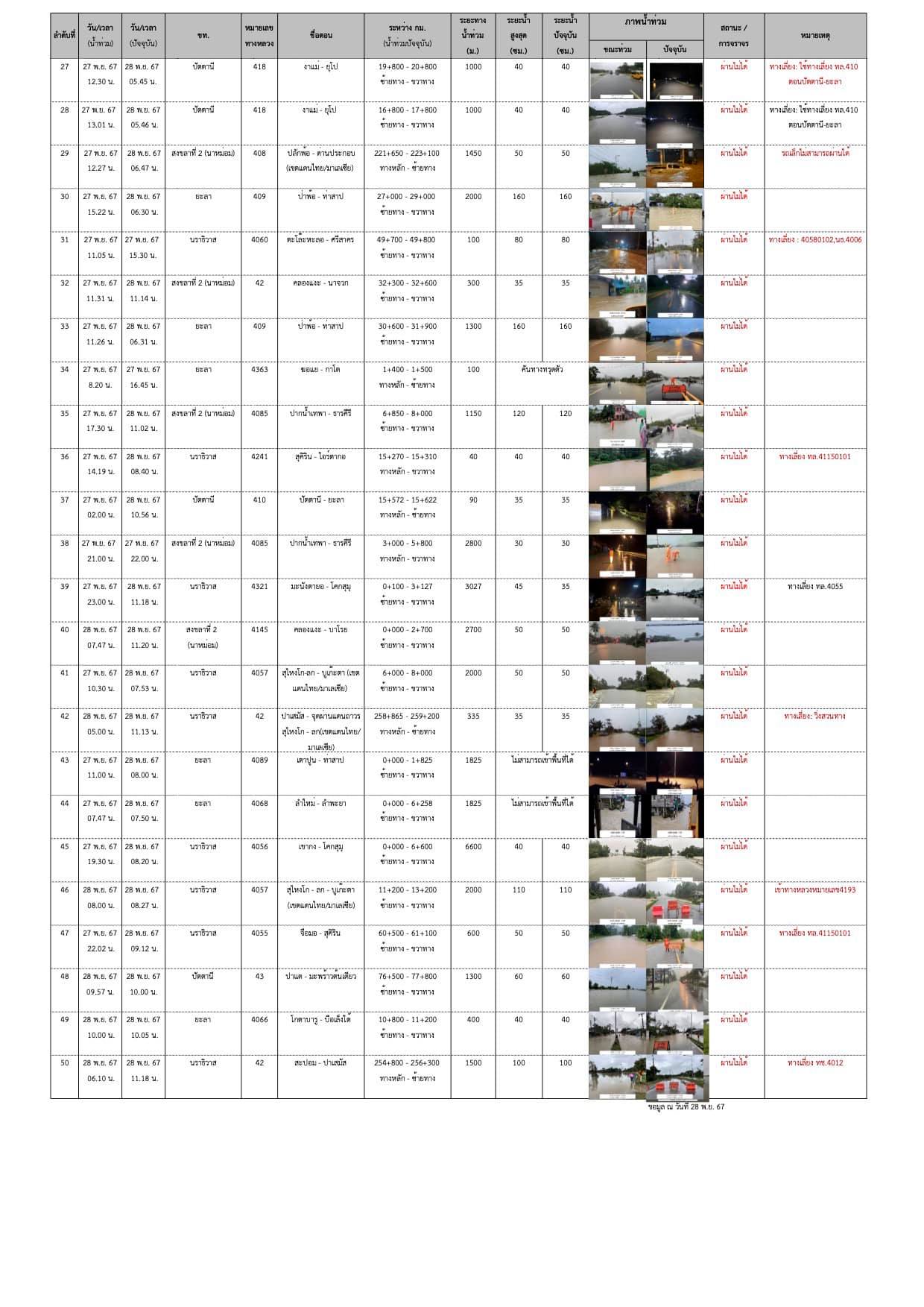 แผนที่แสดงเส้นทางปิดการจราจร เนื่องจากน้ำท่วม ในพื้นที่สำนักงานทางหลวงที่ 18 ระหว่างวันที่ 20-28 พฤศจิกายน 2567