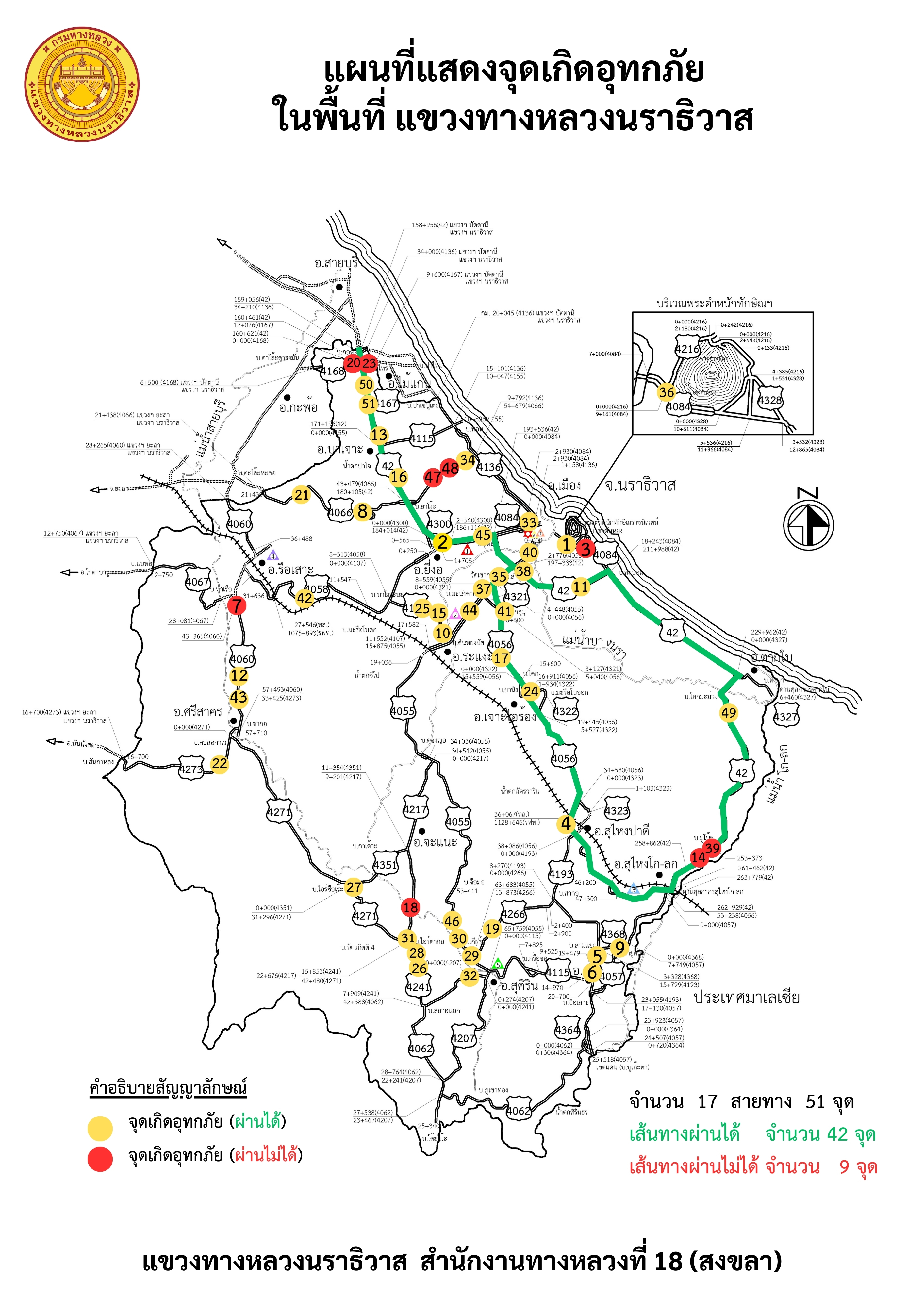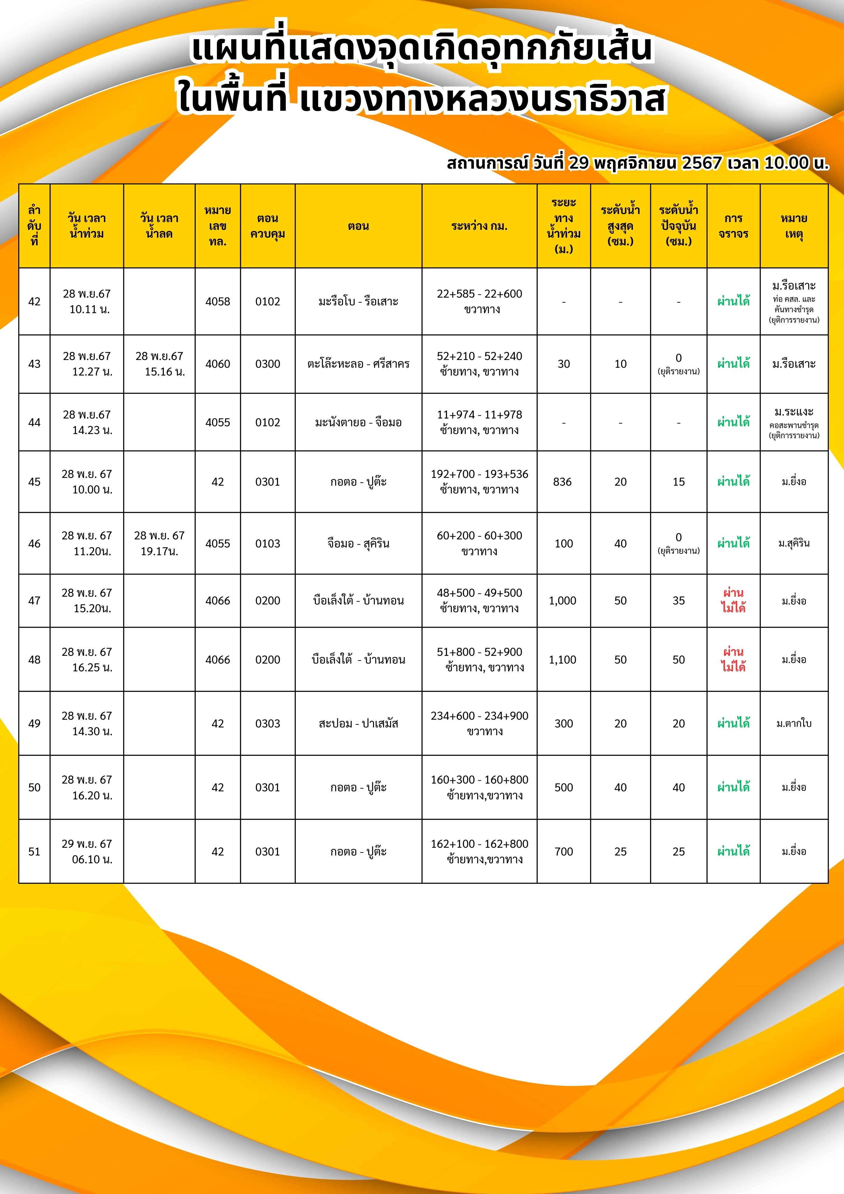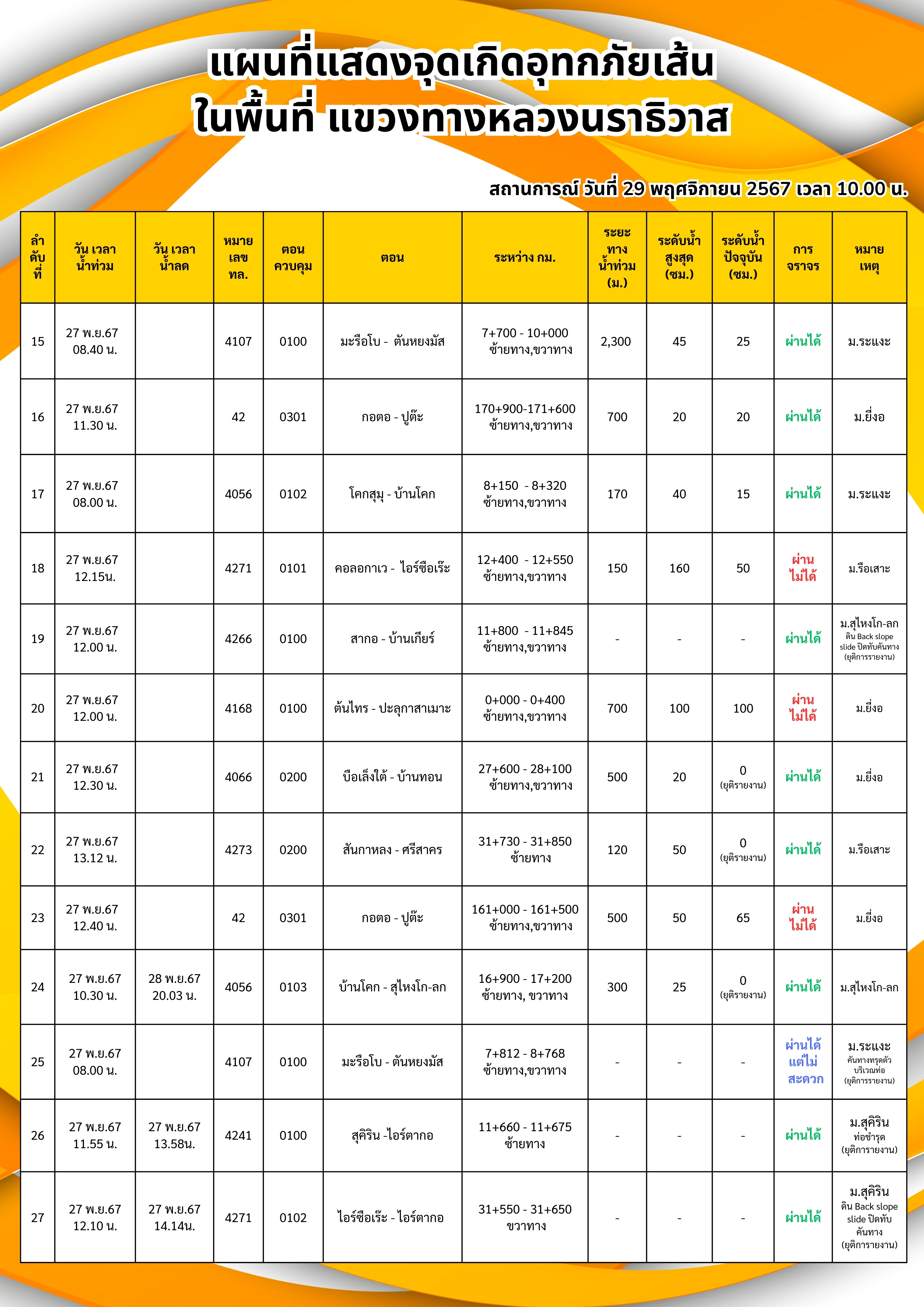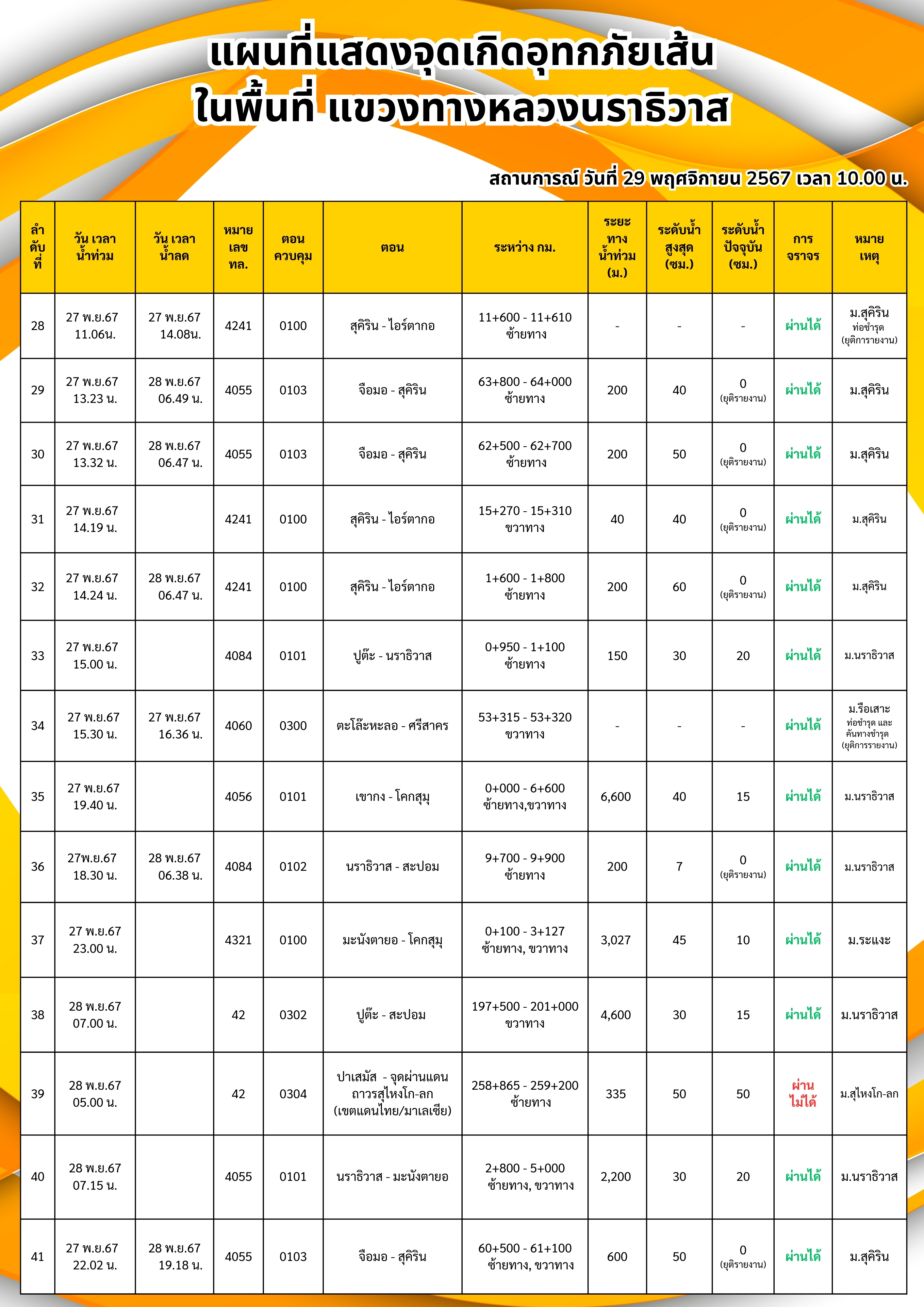 ข้อมูลข่าว : แผนที่แสดงจุดเกิดอุทกภัยภาพรวมแขวงทางหลวงนราธิวาส ข้อมูล ณ วันที่ 29-11-67 เวลา 10.00 น.