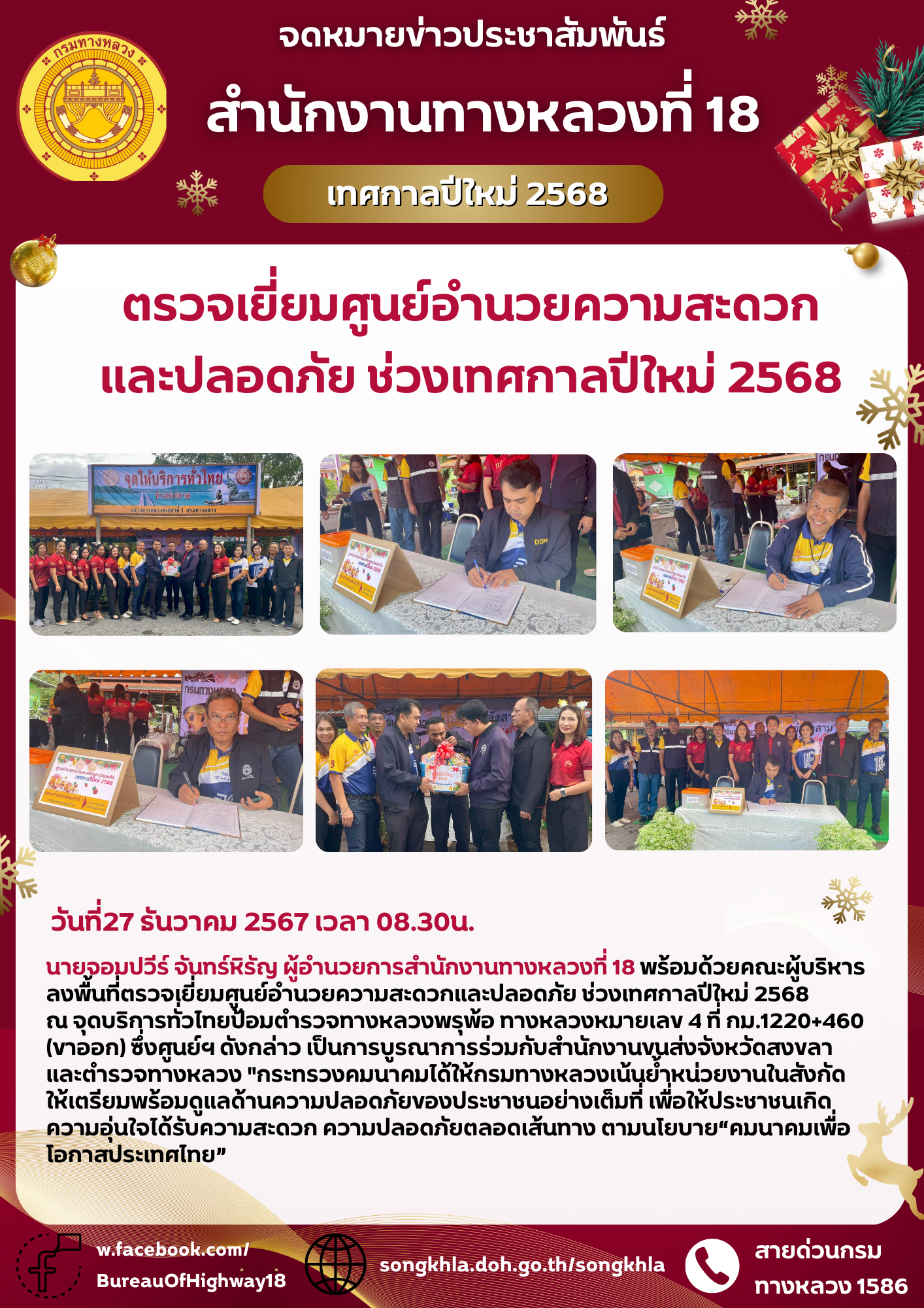 ข้อมูลข่าว : สำนักงานทางหลวงที่ 18” เตรียมพร้อมอำนวยความสะดวก-ปลอดภัยประชาชน รองรับการเดินทางช่วงเทศกาลปีใหม่ 2568 ตลอด 24 ชม