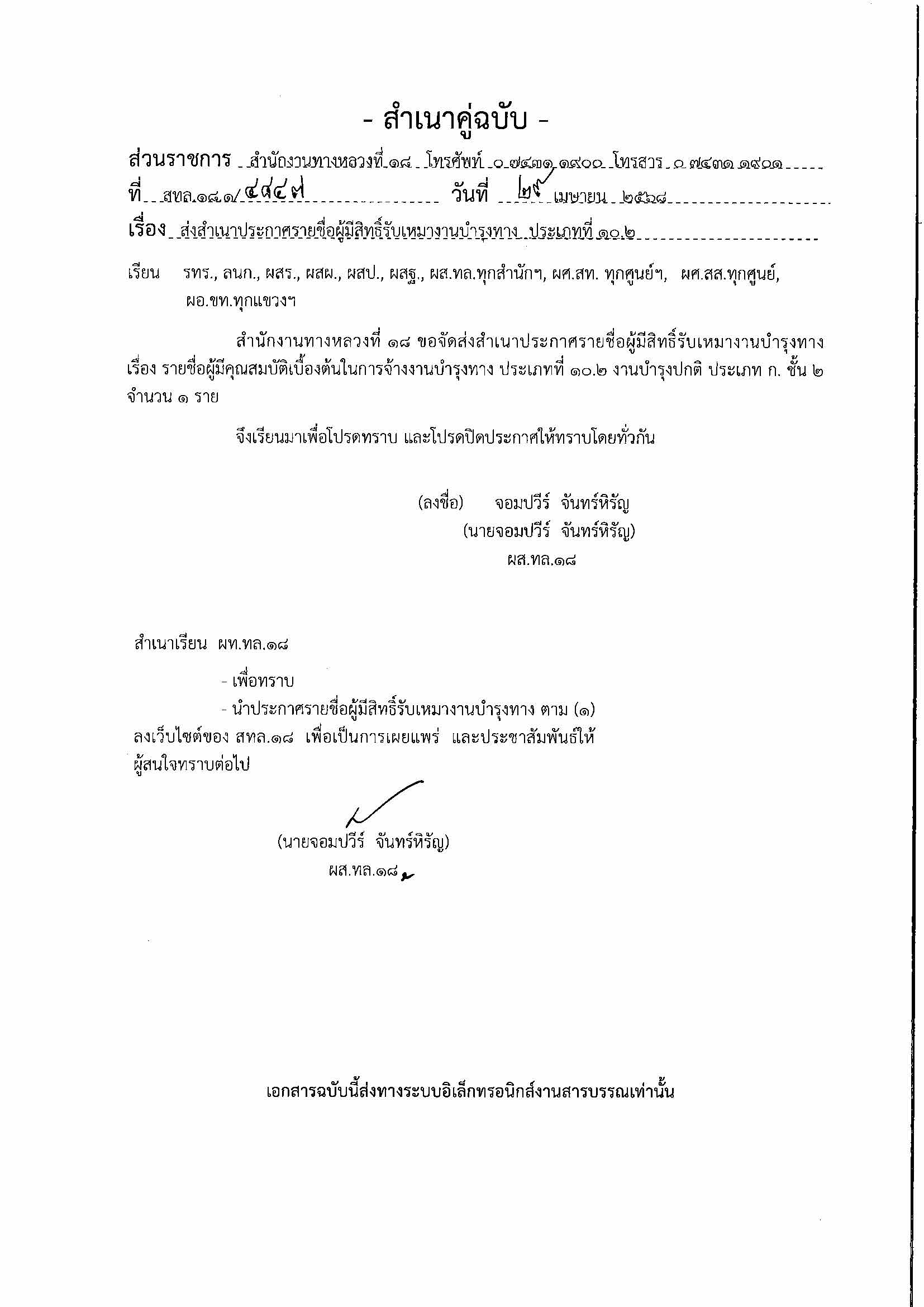 ประกาศรายชื่อผู้มีสิทธิ์รับเหมางานบำรุงทาง ประเภทที่ 10.2