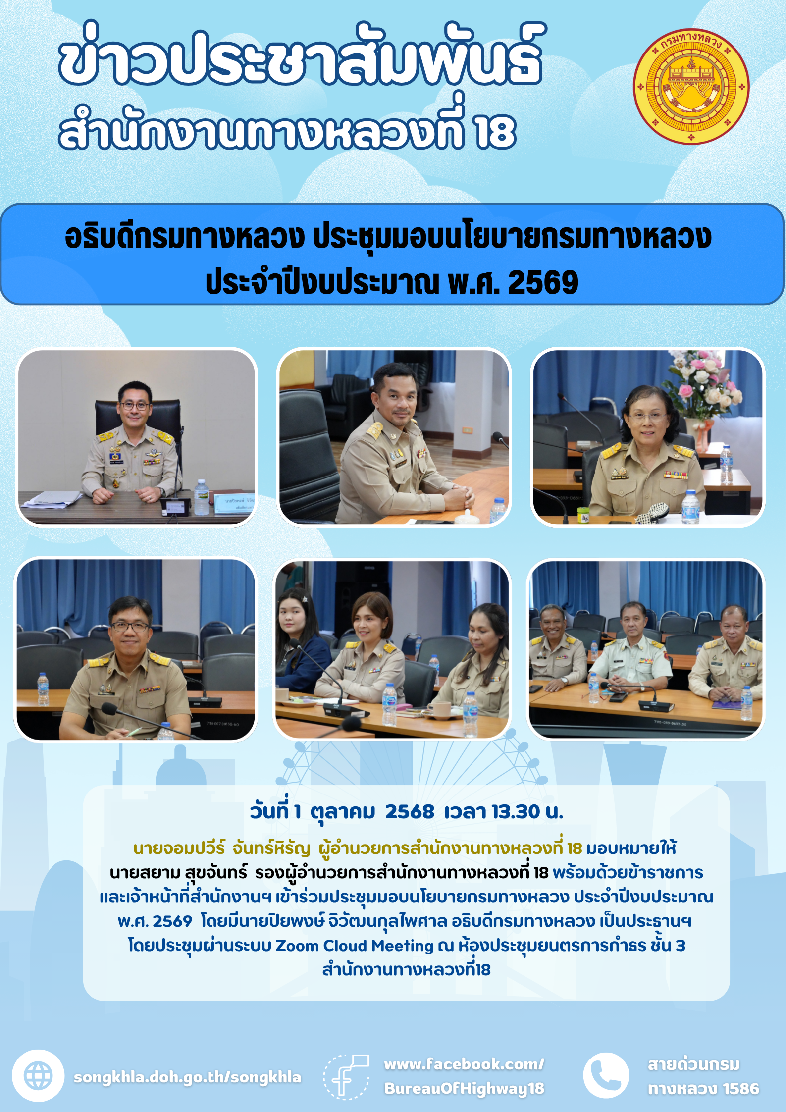 วันที่ 1 ตุลาคม 2568 เวลา 13.30 น. ผู้อำนวยการสำนักงานทางหลวงที่ 18 มอบหมายให้นายสยาม สุขจันทร์ รองผู้อำนวยการสำนักงานทางหลวงที่ 18 พร้อมด้วยข้าราชการ และเจ้าหน้าที่สำนักงานฯ เข้าร่วมประชุมมอบนโยบายกรมทางหลวง ประจำปีงบประมาณ พ.ศ. 2569 โดยมีนายปิยพงษ์ จิวัฒนกุลไพศาล อธิบดีกรมทางหลวง เป็นประธานฯ โดยประชุมผ่านระบบ Zoom Cloud Meeting ณ ห้องประชุมยนตรการกำธร ชั้น 3 สำนักงานทางหลวงที่18