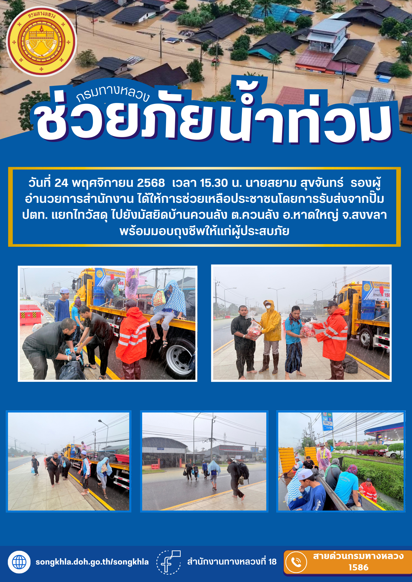 วันที่ 24 พฤศจิกายน 2568 เวลา 15.30 น. นายสยาม สุขจันทร์ รองผู้อำนวยการสำนักงาน ได้ให้การช่วยเหลือประชาชนโดยการรับส่งจากปั๊ม ปตท. แยกไทวัสดุ ไปยังมัสยิดบ้านควนลัง ต.ควนลัง อ.หาดใหญ่ จ.สงขลา พร้อมมอบถุงชีพให้แก่ผู้ประสบภัย