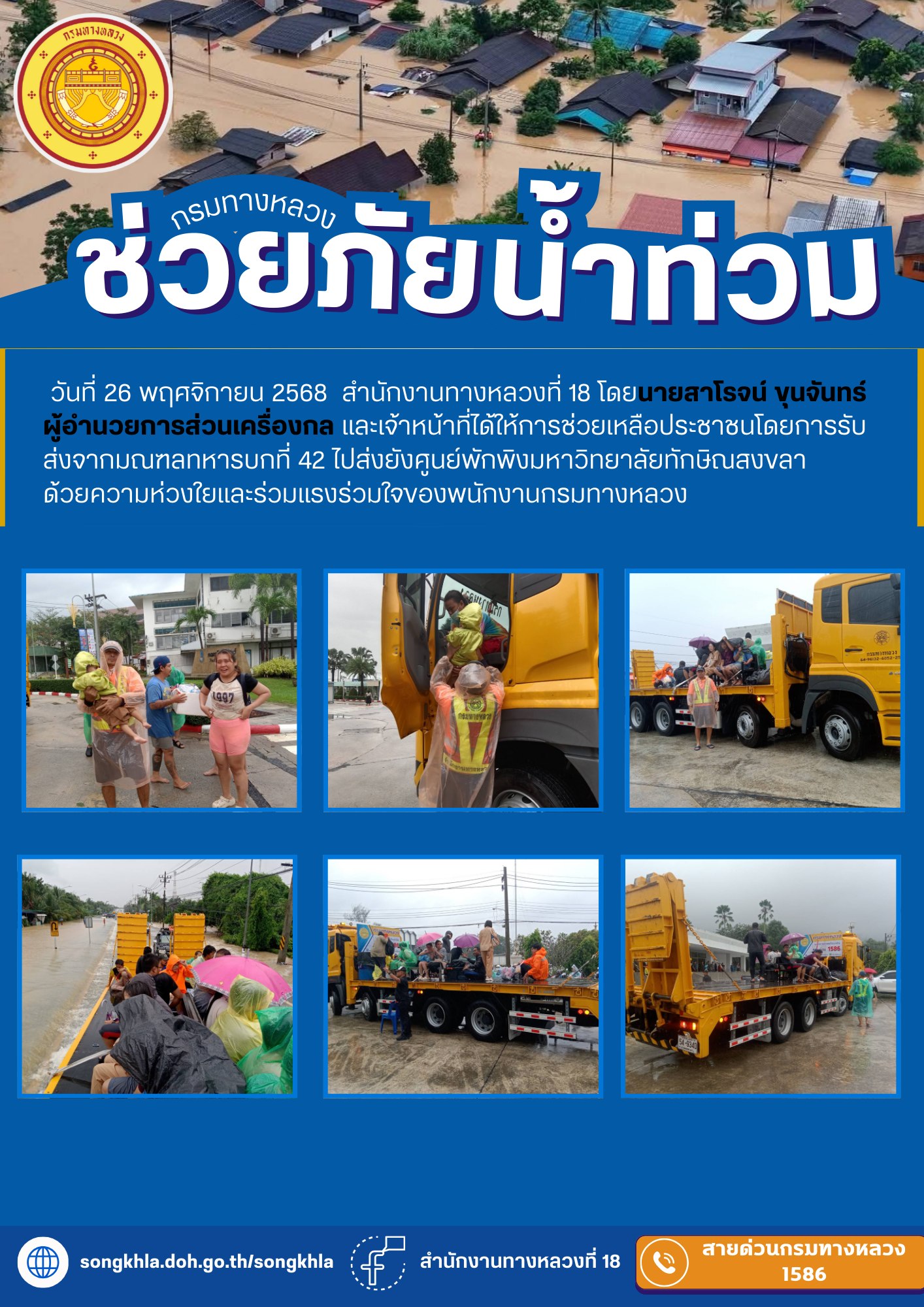 วันที่ 26 พฤศจิกายน 2568 สำนักงานทางหลวงที่ 18 โดยนายสาโรจน์ ขุนจันทร์ ผู้อำนวยการส่วนเครื่องกล และเจ้าหน้าที่ได้ให้การช่วยเหลือประชาชนโดยการรับส่งจากมณฑลทหารบกที่ 42 ไปส่งยังศูนย์พักพิงมหาวิทยาลัยทักษิณสงขลา ด้วยความห่วงใยและร่วมแรงร่วมใจของพนักงานกรมทางหลวง