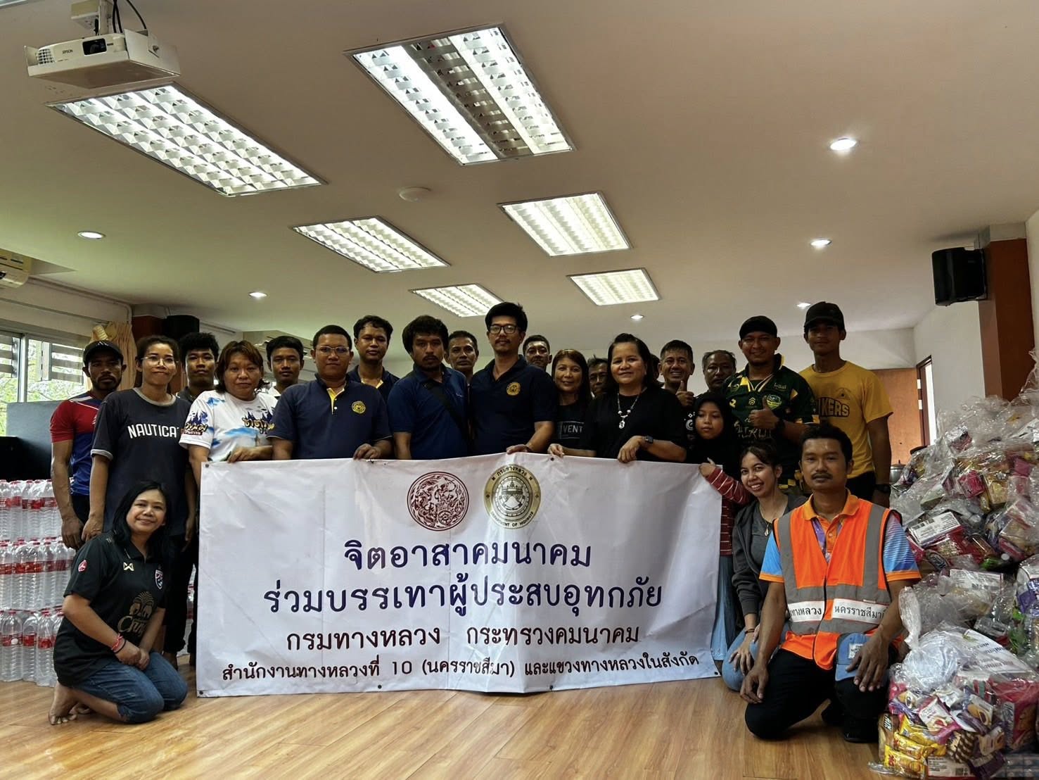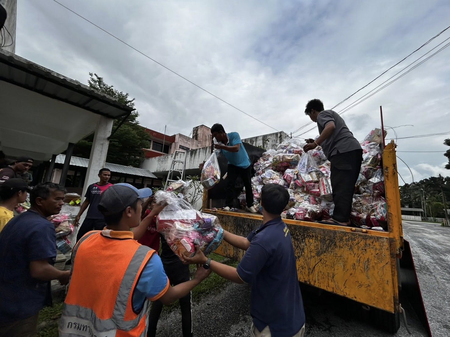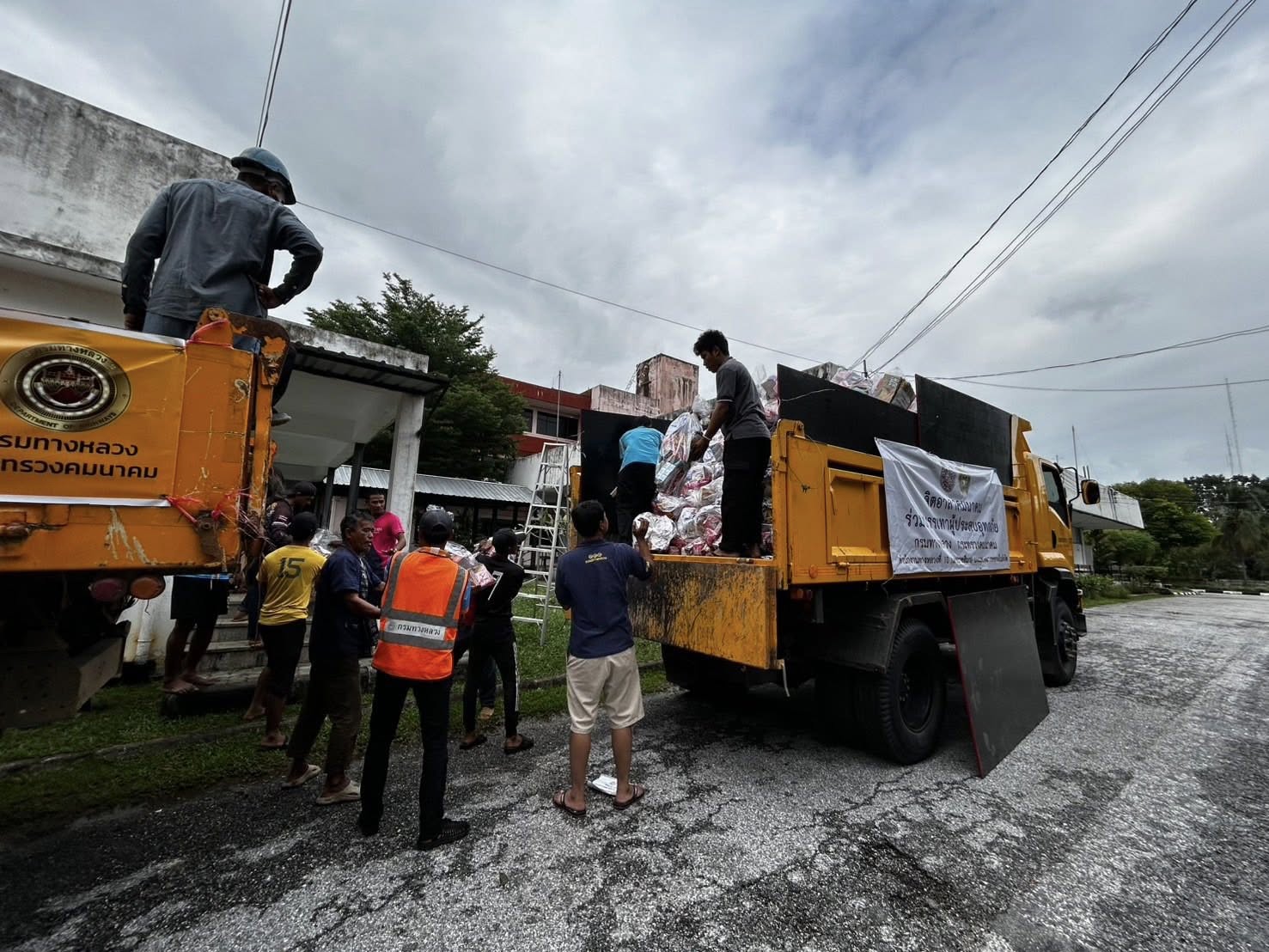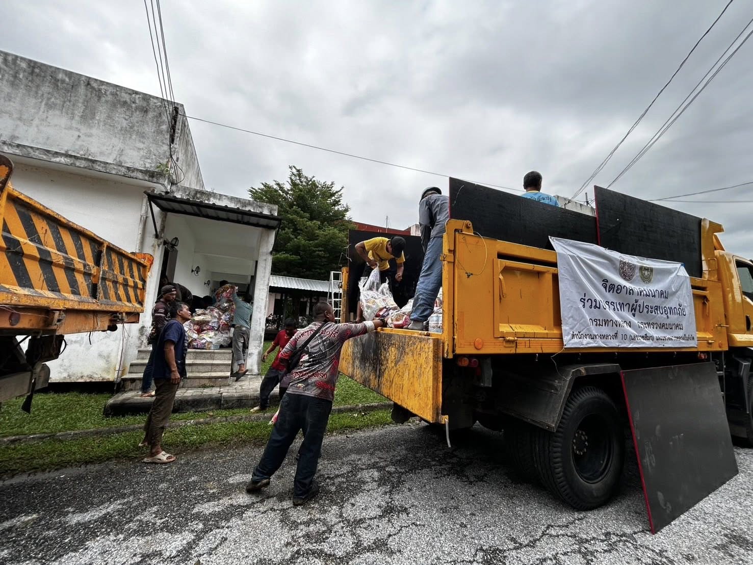 รถคาราวานกรมทางหลวง โดยเจ้าหน้าที่ฯ ได้รับภารกิจส่งถุงยังชีพและน้ำดื่มอย่างละ 1 คันรถ ไปยังแขวงทางหลวงนราธิวาส