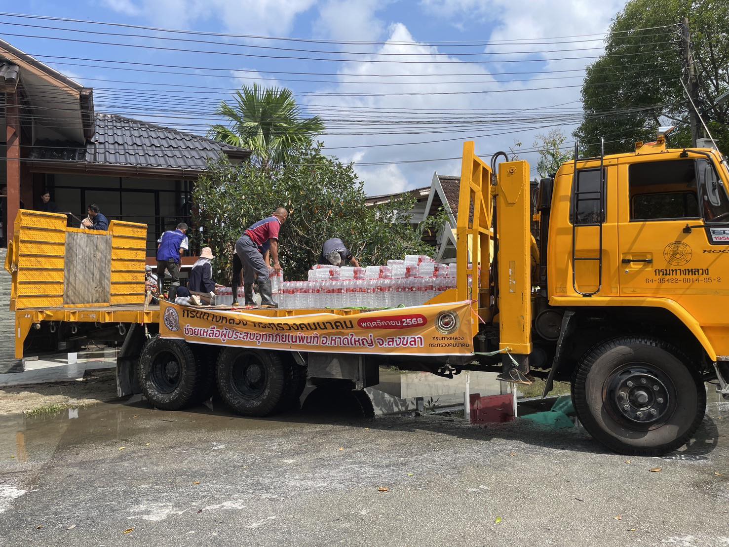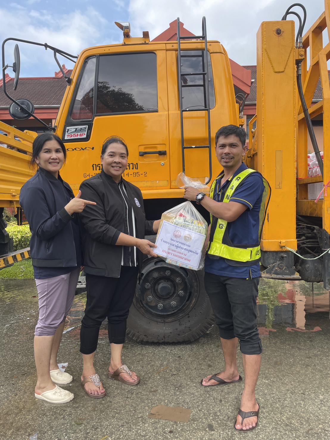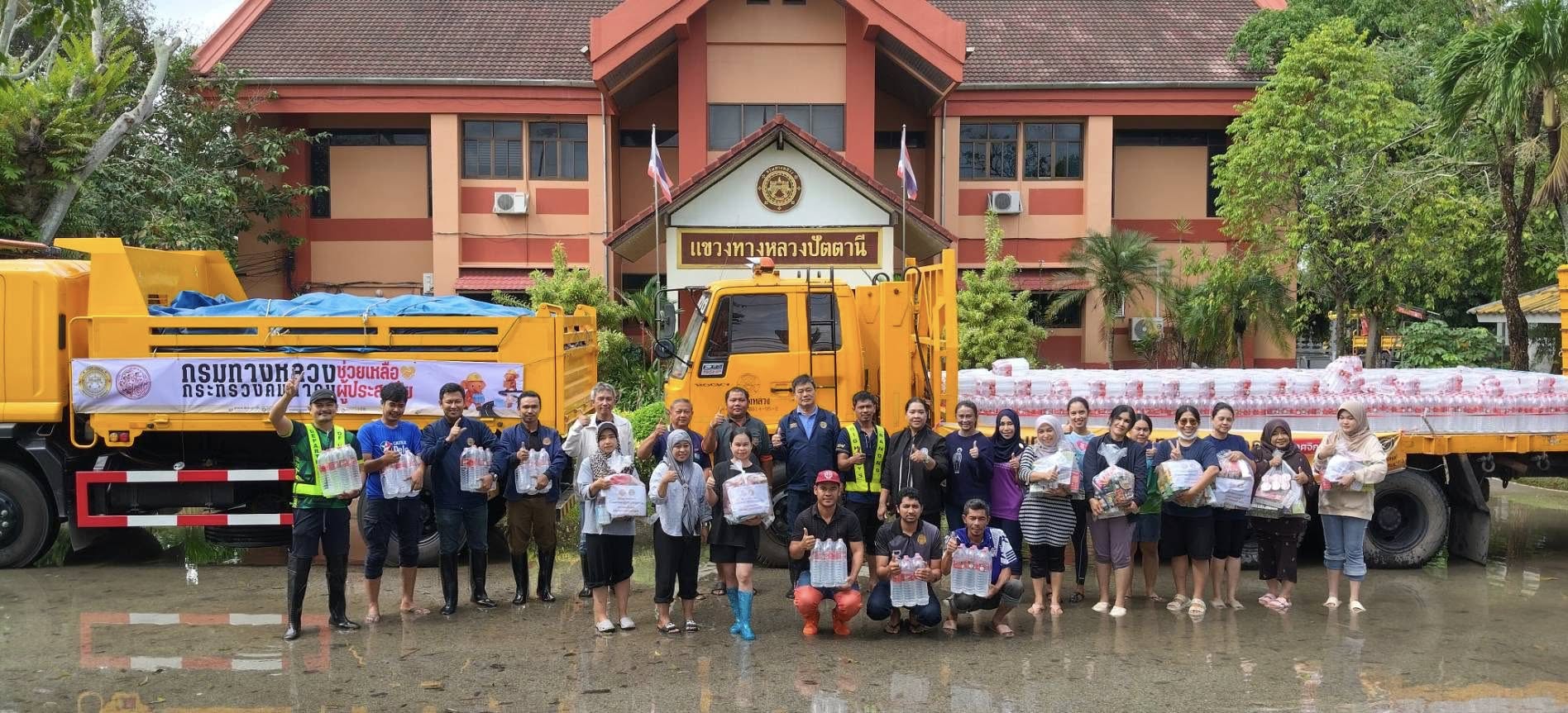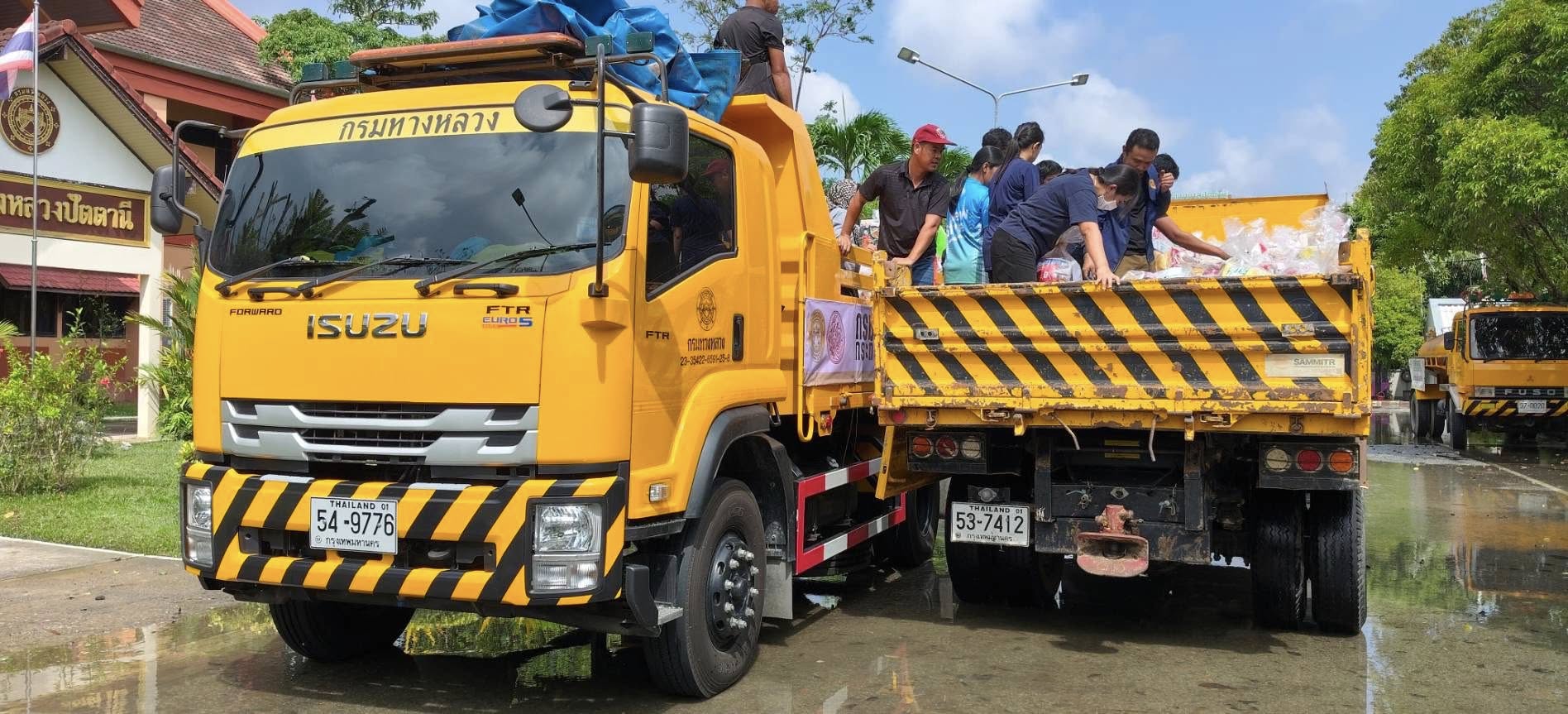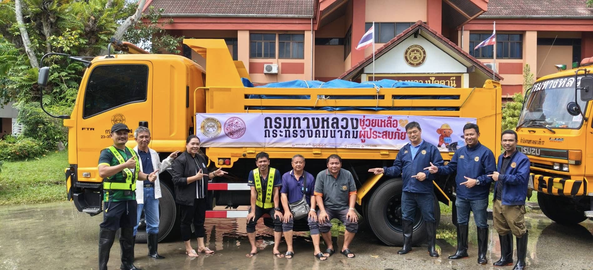 รถคาราวาน กรมทางหลวง โดยเจ้าหน้าที่ฯ ได้รับภารกิจส่งถุงยังชีพและน้ำดื่มอย่างละ 1 คันรถ ไปยังแขวงทางหลวงปัตตานี