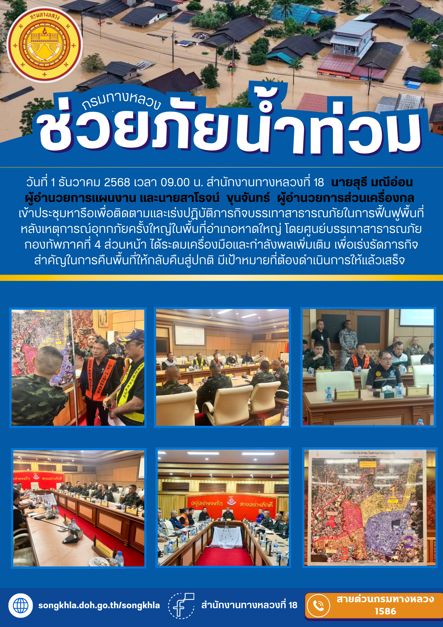 วันที่ 1 ธันวาคม 2568 เวลา 09.00 น. สำนักงานทางหลวงที่ 18 นายสุธี มณีอ่อน ผู้อำนวยการแผนงาน และนายสาโรจน์ ขุนจันทร์ ผู้อำนวยการส่วนเครื่องกล เข้าประชุมหารือเพื่อติดตามและเร่งปฏิบัติภารกิจบรรเทาสาธารณภัยในการฟื้นฟูพื้นที่หลังเหตุการณ์อุทกภัยครั้งใหญ่ในพื้นที่อำเภอหาดใหญ่ โดยศูนย์บรรเทาสาธารณภัยกองทัพภาคที่ 4 ส่วนหน้า ได้ระดมเครื่องมือและกำลังพลเพิ่มเติม เพื่อเร่งรัดภารกิจสำคัญในการคืนพื้นที่ให้กลับคืนสู่ปกติ มีเป้าหมายที่ต้องดำเนินการให้แล้วเสร็จ โดยมีรองผู้บัญชาการทหารสูงสุด เป็นประธานในการประชุมหารือ
