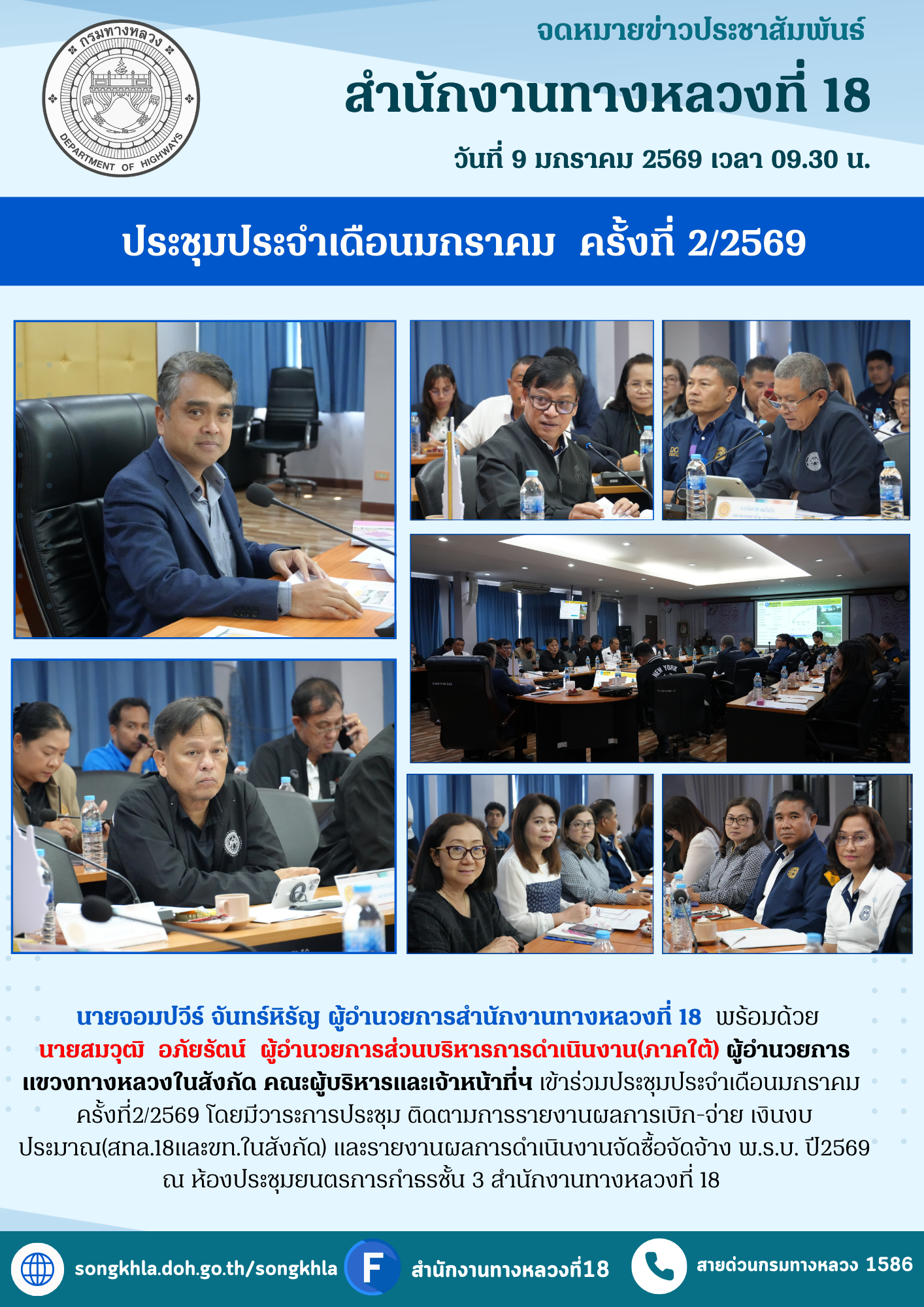 วันที่ 9 มกราคม 2569 เวลา 09.30 น. นายจอมปวีร์ จันทร์หิรัญ ผู้อำนวยการสำนักงานทางหลวงที่ 18 พร้อมด้วยนายสมวุฒิ อภัยรัตน์ ผู้อำนวยการส่วนบริหารการดำเนินงาน(ภาคใต้) ผู้อำนวยการแขวงทางหลวงในสังกัด คณะผู้บริหารและเจ้าหน้าที่ฯ เข้าร่วมประชุมประจำเดือนมกราคม ครั้งที่2/2569 โดยมีวาระการประชุม การติดตามรายงานผลการเบิก-จ่าย เงินงบประมาณ(สทล.18และขท.ในสังกัด) และรายงานผลการดำเนินงานจัดซื้อจัดจ้าง พ.ร.บ. ปี2569 ณ ห้องประชุมยนตรการกำธรชั้น 3 สำนักงานทางหลวงที่ 18