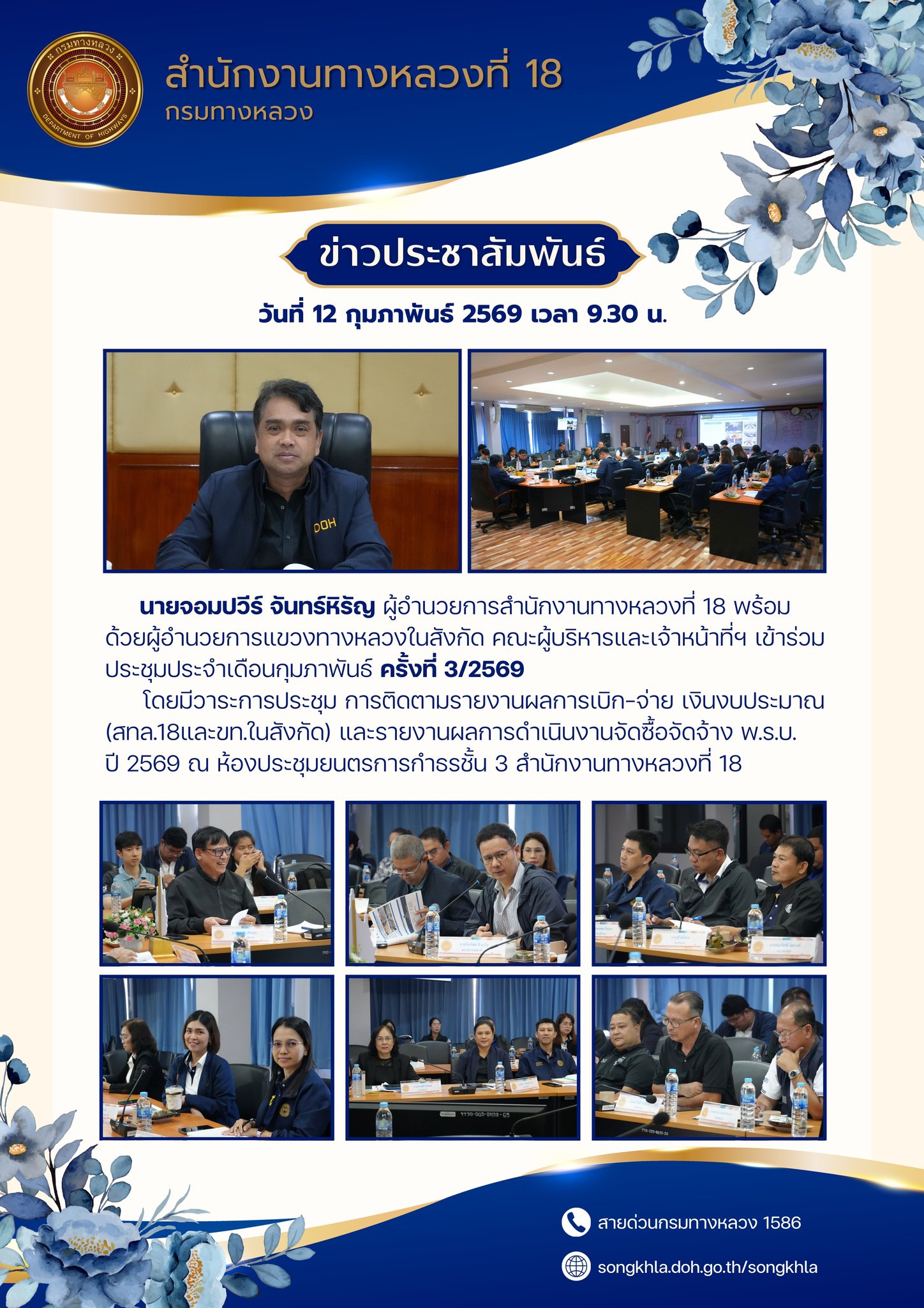 วันที่ 12 กุมภาพันธ์ 2569 เวลา 09.30 น. นายจอมปวีร์ จันทร์หิรัญ ผู้อำนวยการสำนักงานทางหลวงที่ 18 พร้อมด้วยผู้อำนวยการแขวงทางหลวงในสังกัด คณะผู้บริหาร และเจ้าหน้าที่ที่เกี่ยวข้อง เข้าร่วมการประชุมประจำเดือน ครั้งที่ 3/2569 ในการประชุมครั้งนี้ มีวาระสำคัญ ได้แก่การติดตามรายงานผลการเบิกจ่ายเงินงบประมาณของสำนักงานทางหลวงที่ 18 และแขวงทางหลวงในสังกัดการรายงานผลการดำเนินงานด้านการจัดซื้อจัดจ้าง ตามพระราชบัญญัติฯ ประจำปีงบประมาณ พ.ศ. 2569 ทั้งนี้ การประชุมจัดขึ้น ณ ห้องประชุมยนตรการกำธร ชั้น 3 สำนักงานทางหลวงที่ 18