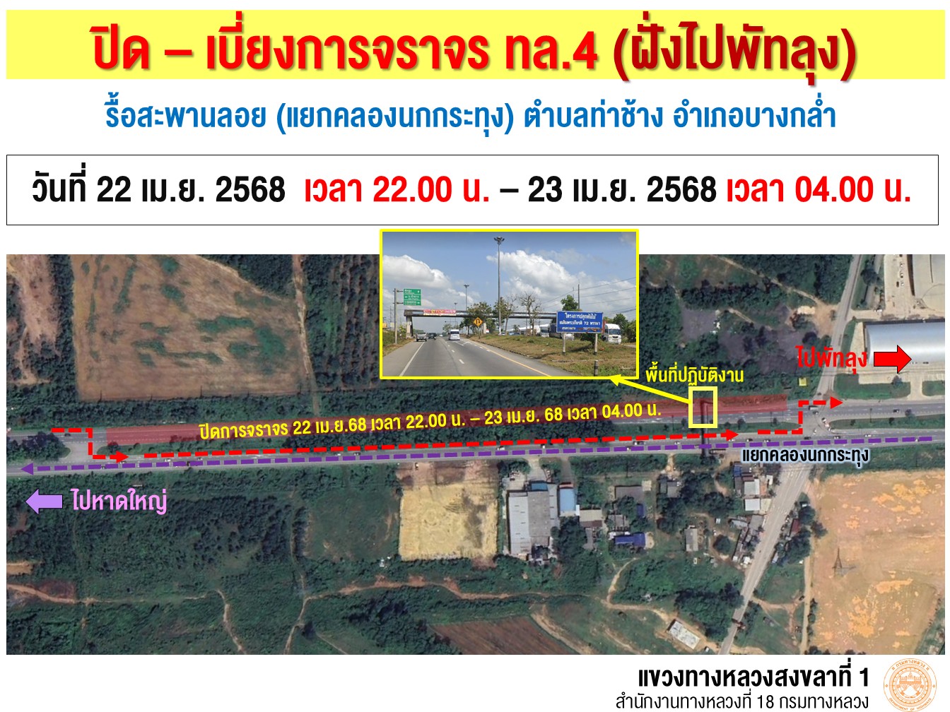 แจ้งปิด-เบี่ยงช่องจราจร ทางหลวงหมายเลข 4 เพื่อรื้อสะพานลอย บริเวณแยกคลองนกกระทุง