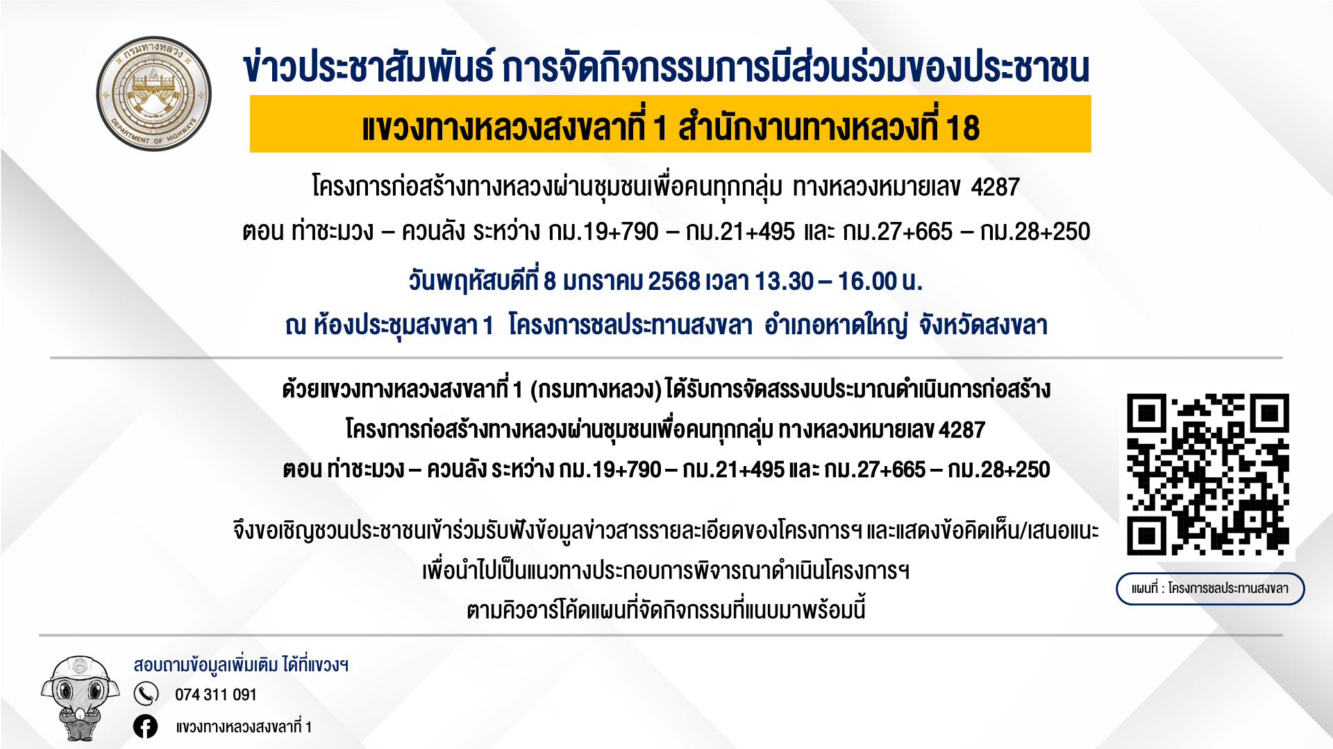 ขอเชิญเข้าร่วมประชุมเพื่อการมีส่วนร่วมของประชาชน กิจกรรมก่อสร้างทางหลวงผ่านชุมชนเพื่อคนทุกกลุ่ม ทางหลวงหมายเลข 4135 ตอน ทางเข้าสนามบินหาดใหญ่ ระหว่าง กม.8+545 - กม.10+168