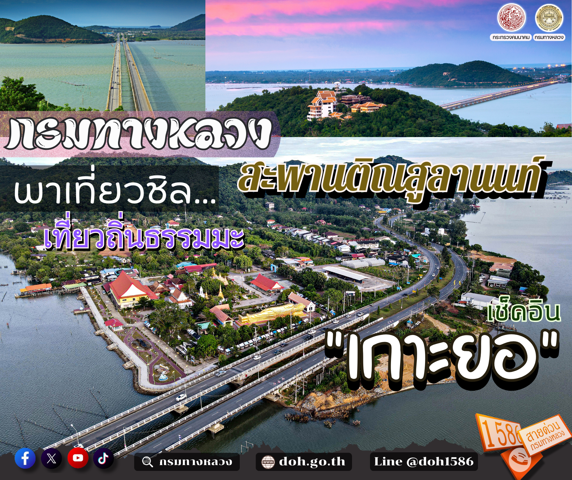 กรมทางหลวง (ทล.) พาเที่ยวชมเส้นทางธรรมชาติ แหล่งท่องเที่ยวบน “เกาะยอ” ผ่านสะพานคอนกรีตที่ยาวที่สุด ในประเทศไทย เป็นสะพานที่ทอดยาวข้ามทะเลสาบสงขลาอยู่ในอำเภอเมืองสงขลา และอำเภอสิงหนคร โดยเชื่อมเกาะยอ 2 ด้าน ระหว่างฝั่งบ้านน้ำกระจาย อำเภอเมืองและบ้านเขาเขียว อำเภอสิงหนคร ลัดเลาะ ไหว้พระทำบุญช่วงสงกรานต์ นั่งชิลคาเฟ่บรรยากาศพระอาทิตย์ตกดิน