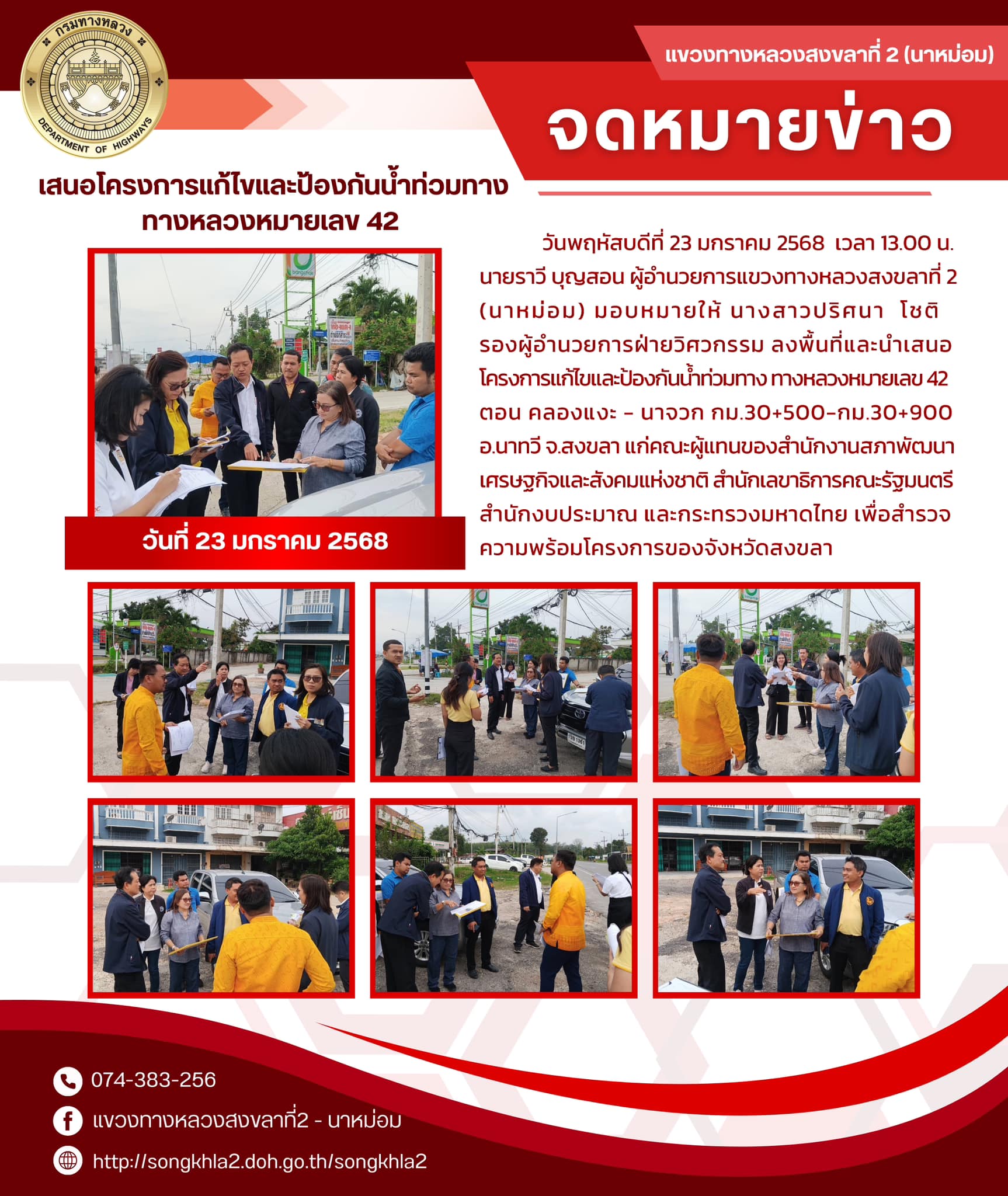 วันพฤหัสบดีที่ 23 มกราคม 2568 เวลา 13.00 น. นายราวี บุญสอน ผู้อำนวยการแขวงทางหลวงสงขลาที่ 2 (นาหม่อม) มอบหมายให้นางสาวปริศนา โชติ รองผู้อำนวยการฝ่ายวิศวกรรม ลงพื้นที่และนำเสนอโครงการแก้ไขและป้องกันน้ำท่วมทาง ทางหลวงหมายเลข 42 ตอน คลองแงะ-นาจวก กม.30+500-กม.30+900 อ.นาทวี จ.สงขลา แก่คณะผู้แทนของสำนักงานสภาพัฒนาเศรษฐกิจและสังคมแห่งชาติ สำนักเลขาธิการคณะรัฐมนตรีสำนักงบประมาณ และกระทรวงมหาดไทย เพื่อสำรวจความพร้อมโครงการของจังหวัดสงขลา